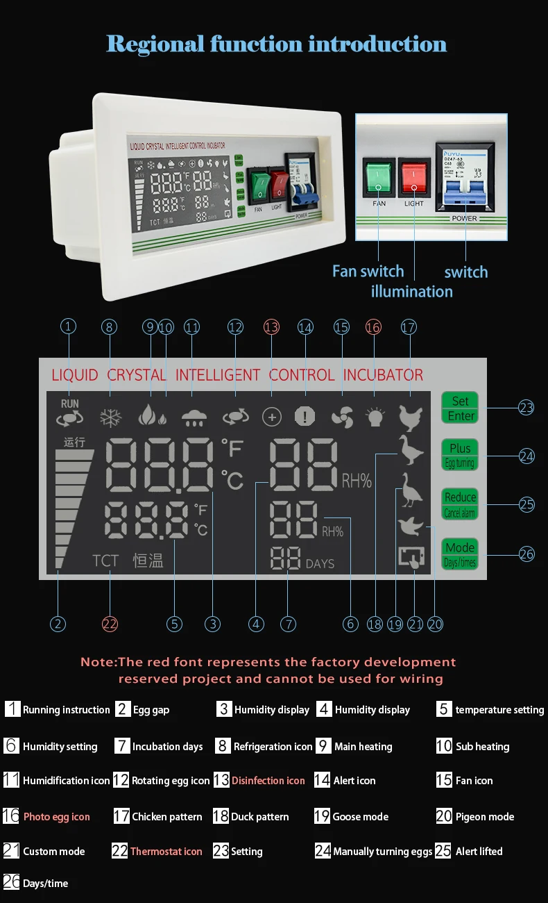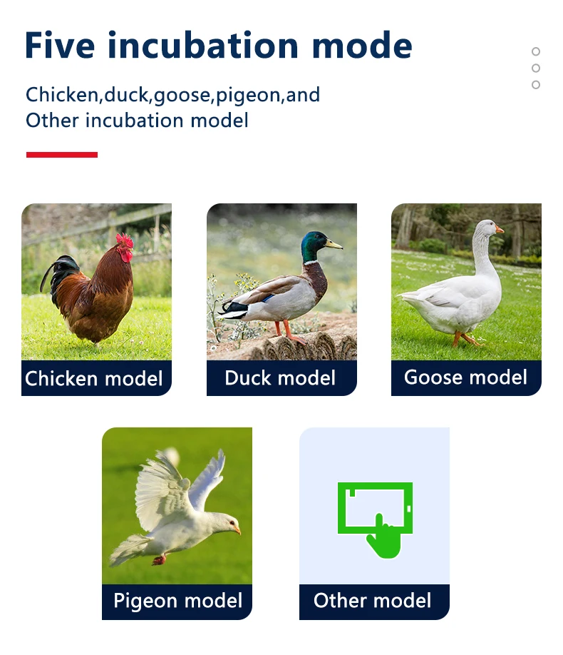 Очеловеченный полноцветный экран выглядит красиво и визуально. В то же время пользователи могут свободно выбирать на заказ, курицу, утку, гуся, голубь, пять режимов вылупления, используя новейшую микроэлектронику