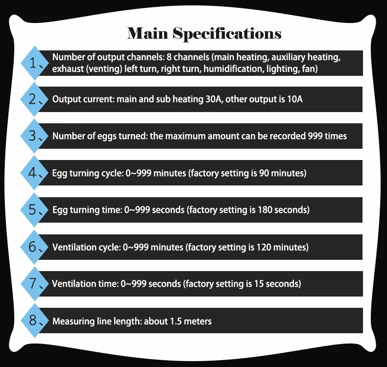 8. Цикл вращения яиц: 0 ~ 360 минут (заводская установка на 90 минут)