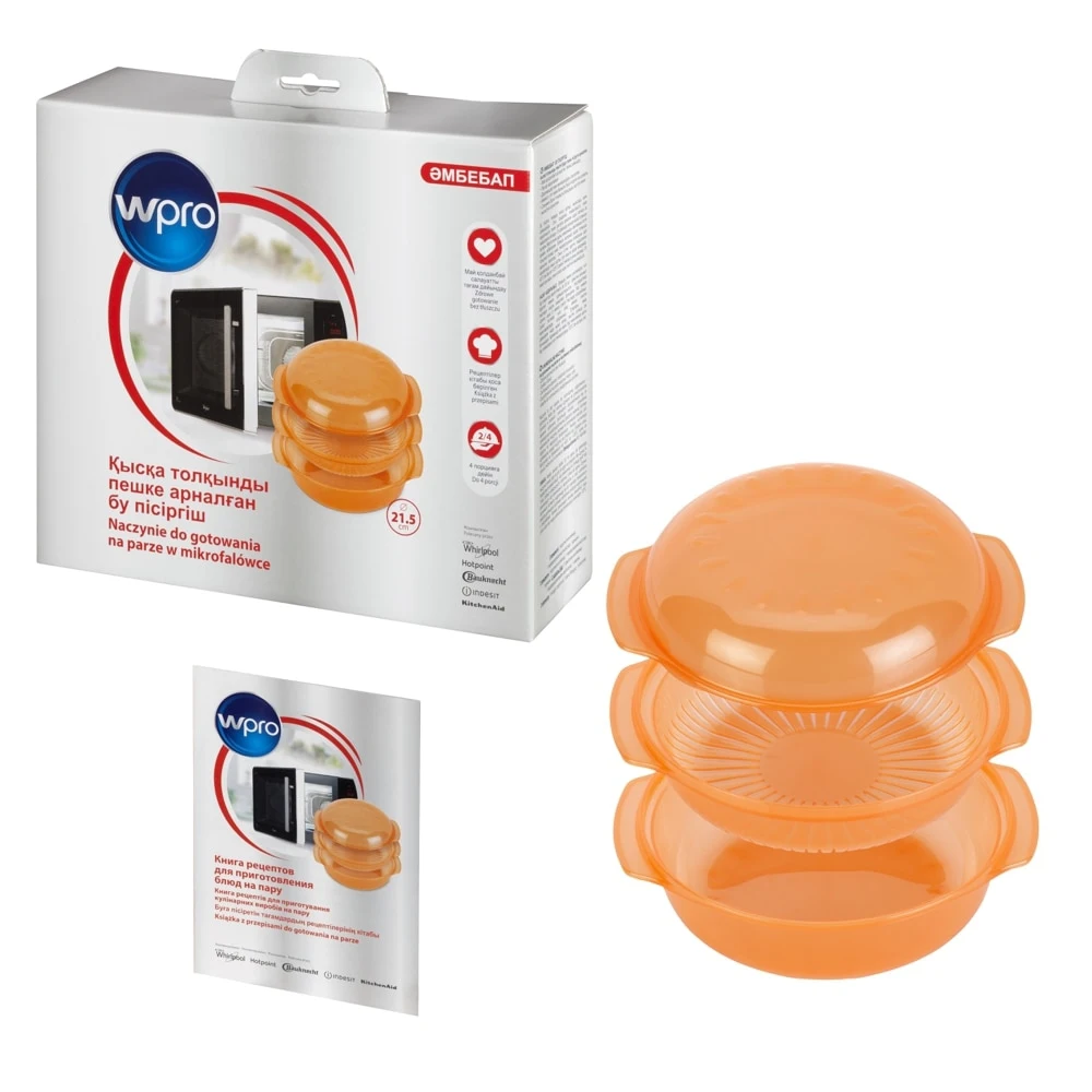 Универсальная пароварка для микроволновой печи Wpro позволяет Вам готовить здоровые и вкусные блюда. В комплекте с книгой рецептов, где Вы можете найти рецепты всех видов блюд: от закусок до десертов.