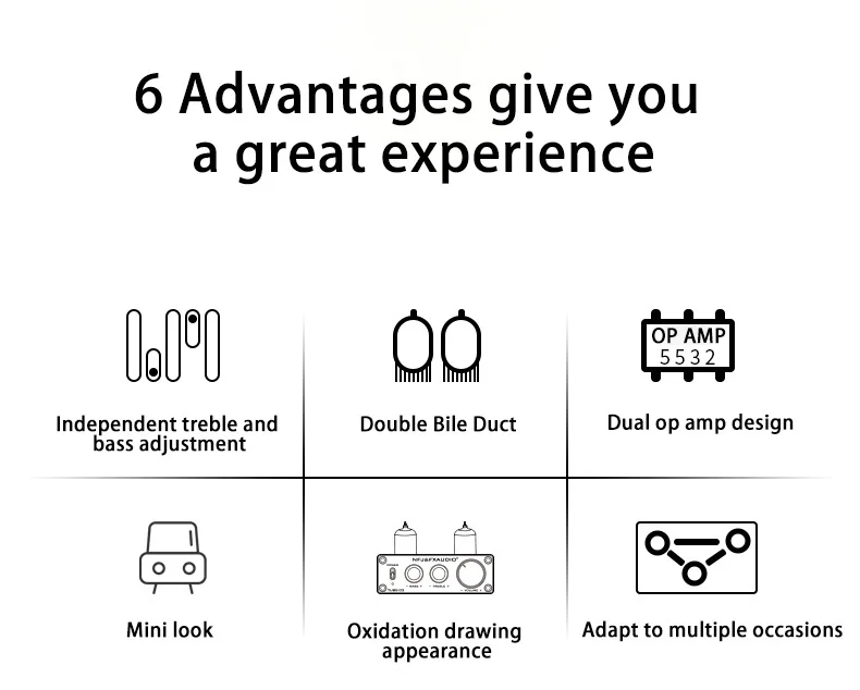 Преусилитель bile использует электронную трубку в качестве основного компонента для регулировки тона. Звук более отличительный, чем преусилитель транзисторов. Его замечательное преимущество заключается в том, что звук сладкий и мягкий, естественный и дружелюбный, особенно с большим динамическим диапазоном, который будет более влажным и деликатным, не легко сохнет, да, опыт прослушивания отличается от транзисторов.