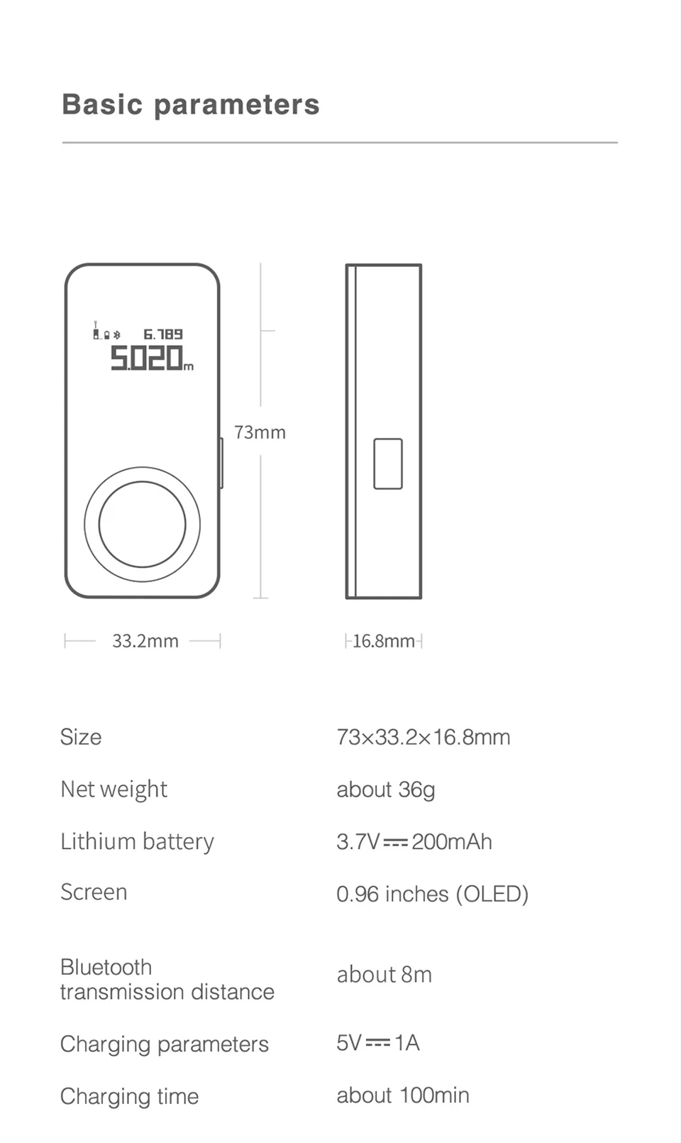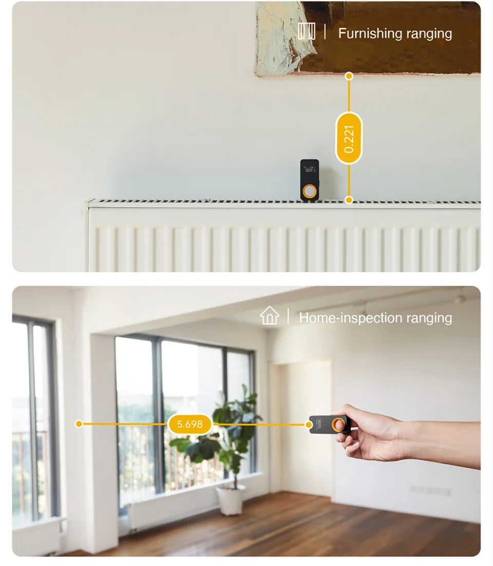 Умный лазерный измеритель имеет только одну кнопку. Нажмите и удерживайте для начала, а затем нажмите, чтобы начать измерение.