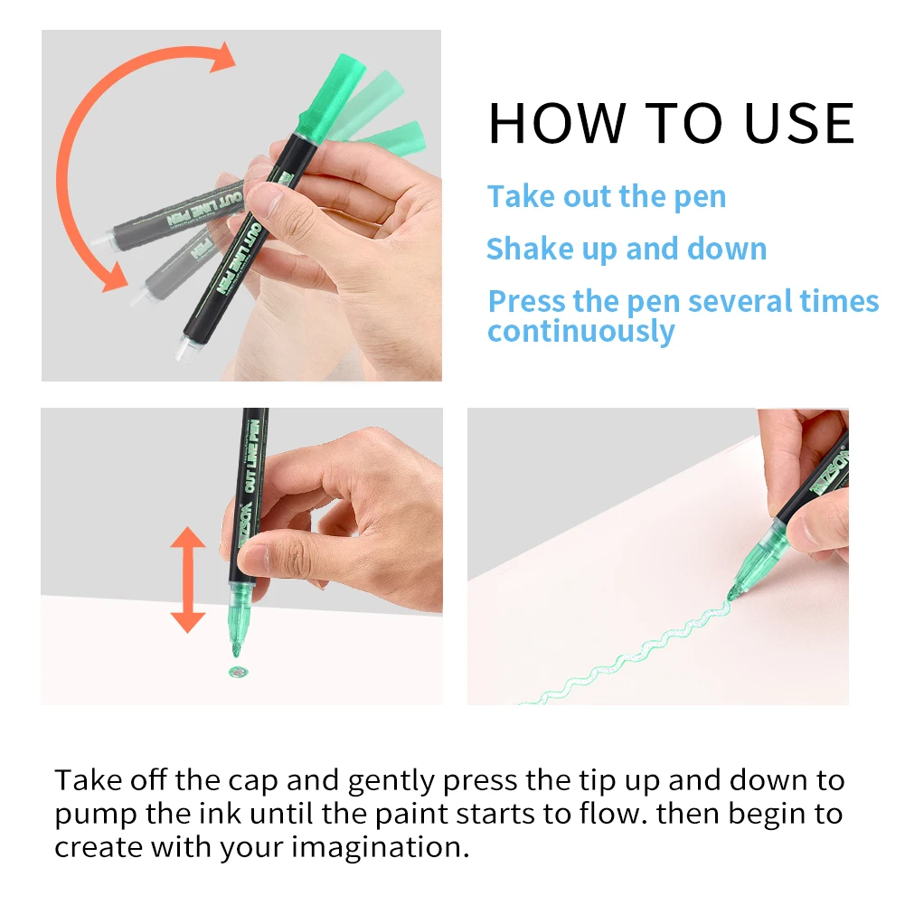 «Легко использовать-с крышкой, хорошо встряхните маркер, чтобы смешать чернила. Снимите крышку и слегка нажмите на кончик на поверхности несколько раз, чтобы прокачать чернила, пока он не начнет течь. Для достижения наилучших результатов повторно закройте маркеры сразу после использования и храните горизонтально. Советуем написать на бумаге с 80 ГСМ выше, в противном случае произойдет небольшое прохождение.