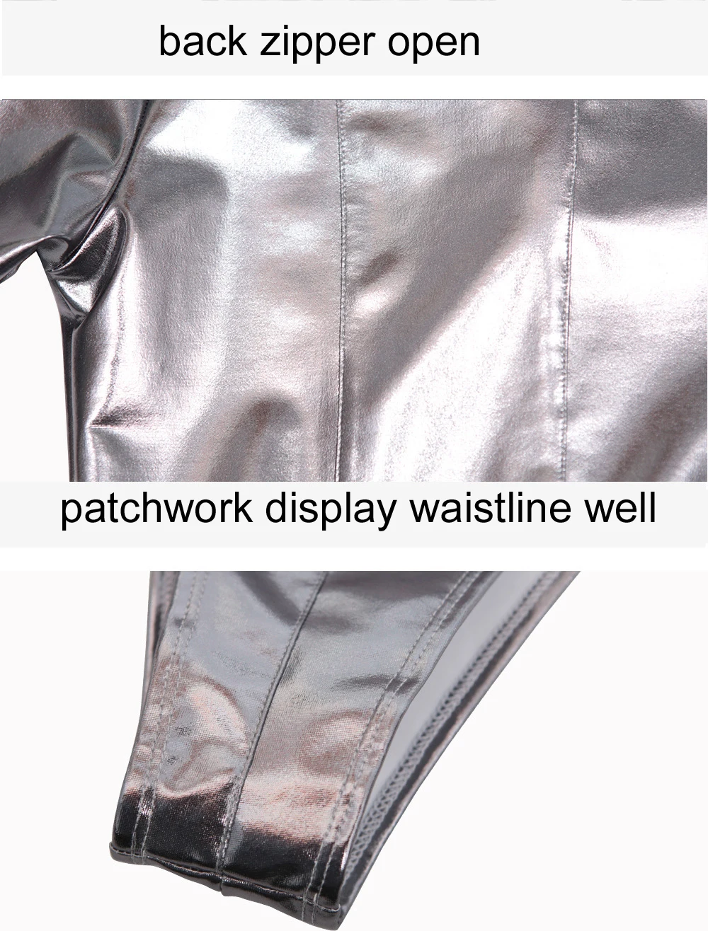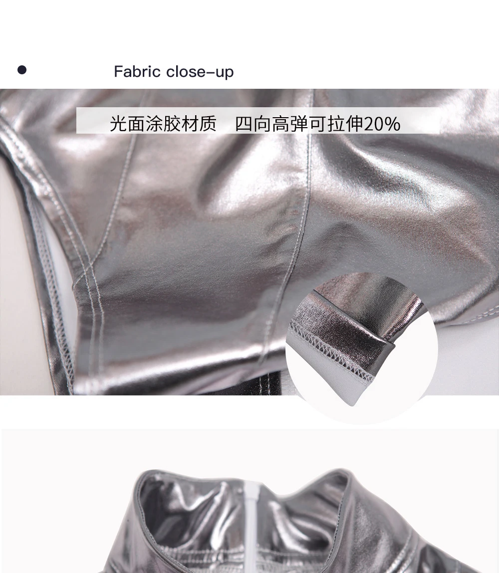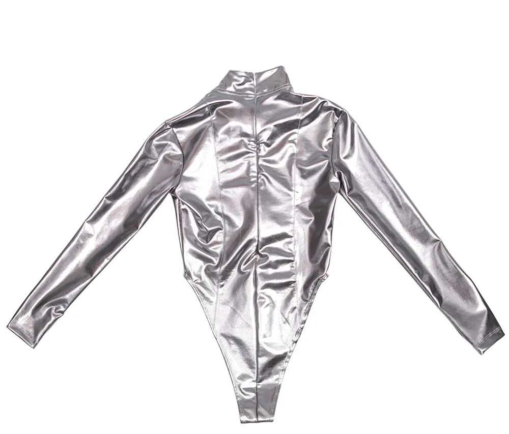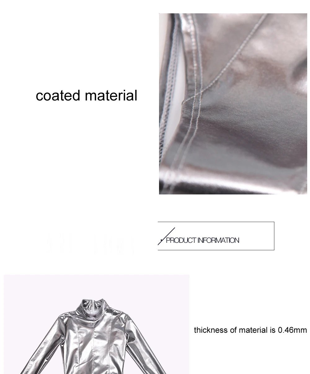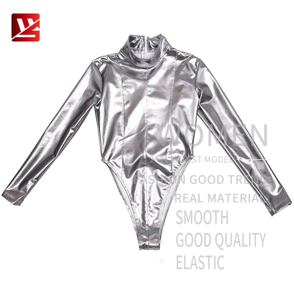 Из искусственной кожи боди с серебряным покрытием с длинным рукавом, купальный костюм с высоким вырезом, колготки и чулки, сексуальное эротическое трико Клубная Одежда для танцев на пилоне
