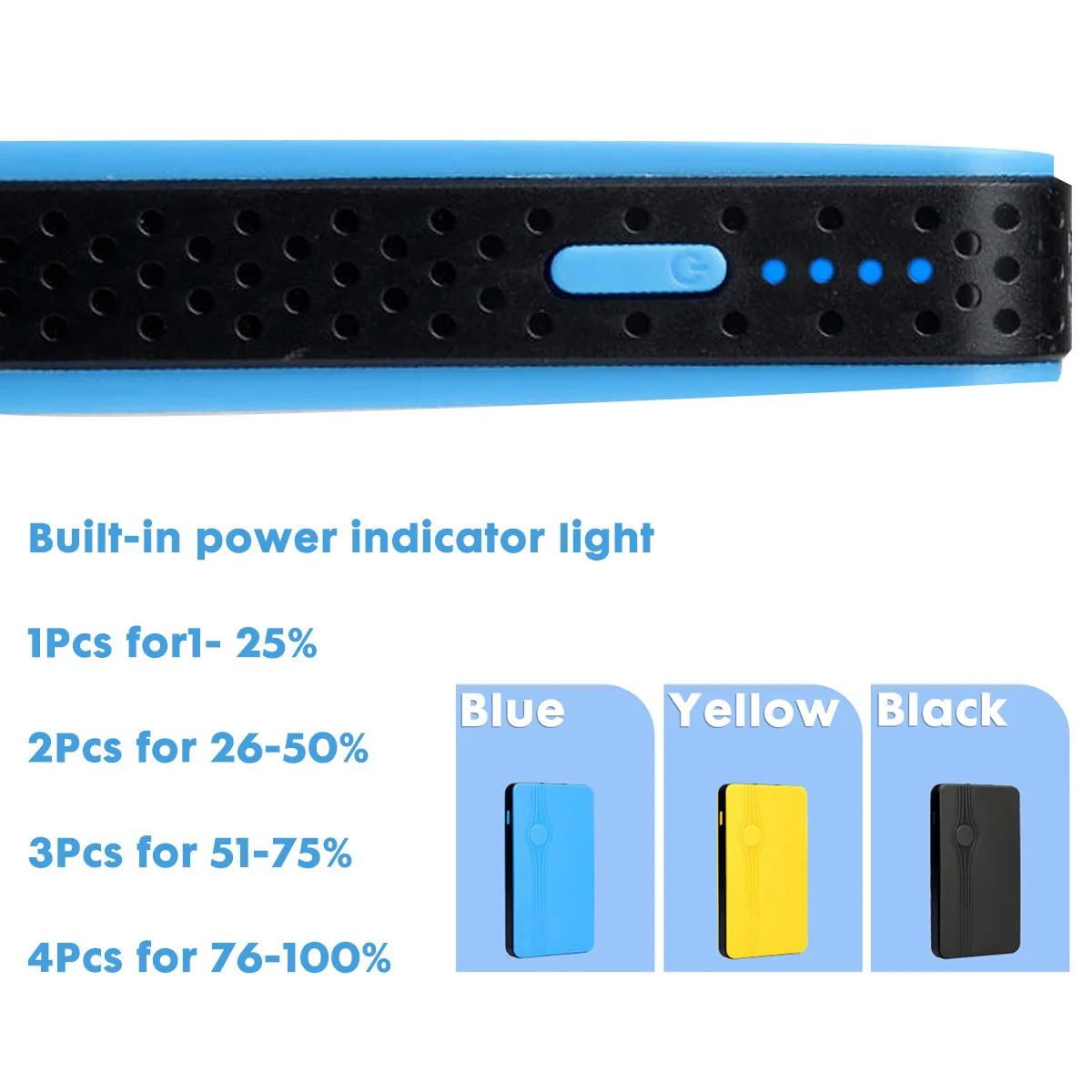 4. Built-in power indicator light, 1Pcs for1~ 25%, 2Pcs for 26~50%, 3Pcs for 51~75% and 4Pcs for 76~100%.