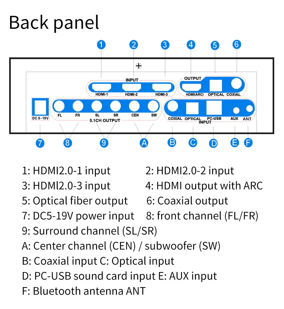1: Support HDMI(x3)+Coaxial+ Optical+PC-USB+AUX+USB 2.0+Bluetooth V5.0 input.