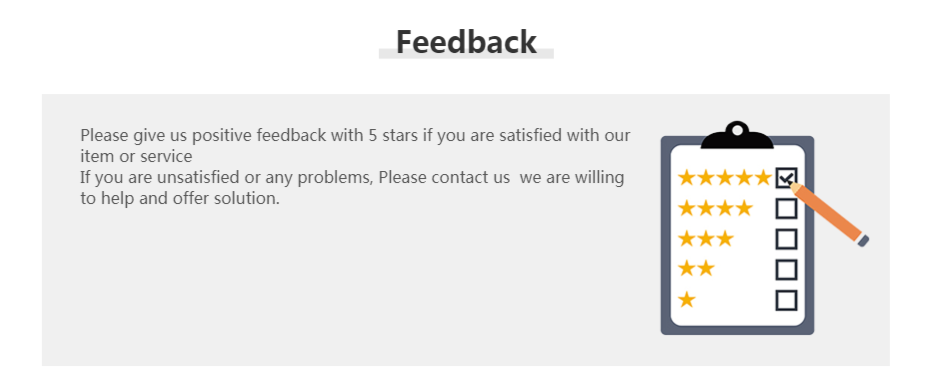 Если вам нравятся наши продукты, пожалуйста, не стесняйтесь дать нам 5 звезд. Если по какой-либо причине вы не удовлетворены, пожалуйста, не оставляйте негативные отзывы, просто свяжитесь с нами, мы постараемся сделать все возможное, чтобы Вы остались довольны.
