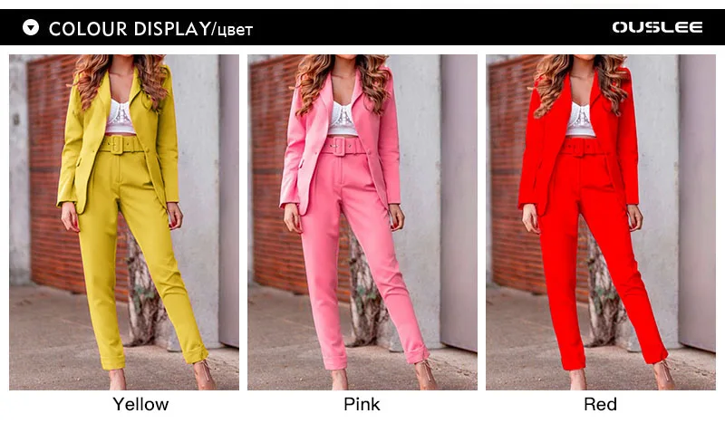 Ouslee офисные Карамельный цвет, комплект из 2 предметов с длинным рукавом блейзеры с вытачками ботильоны Длина пояса Штаны с высокой посадкой женский Повседневная обувь