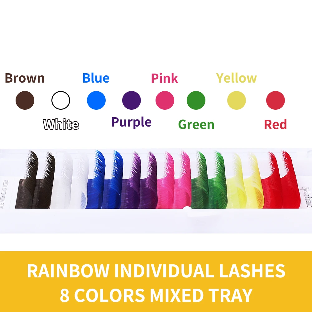 Радужные ресницы-это смесь 8 популярных красочных ресниц. Цвета идеально подходят для ваших нужд, как для начинающих, так и для тех, кто хочет попробовать красочные ресницы, но не уверены, какой цвет им нужен. Купите один, чтобы получить 8 цветов, достаточно, чтобы вы могли изучить, какой цвет вам больше подходит.