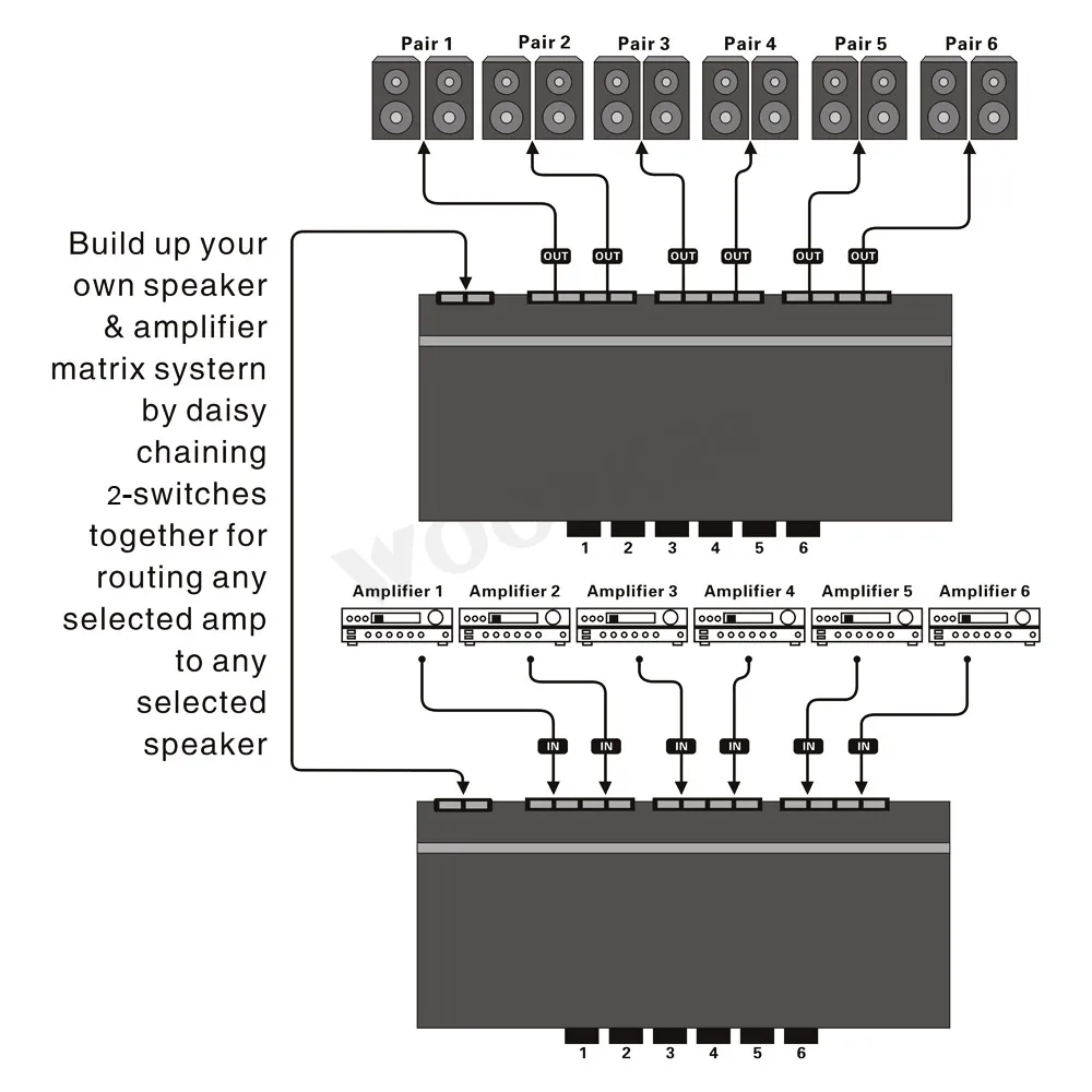 Connect Подключите несколько усилителей/приемников к паре динамиков в качестве выбора усилителя для выбора одного усилителя/приемника.