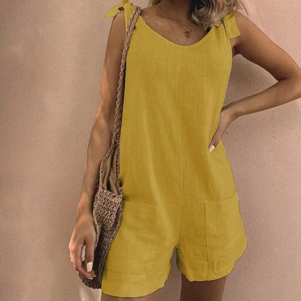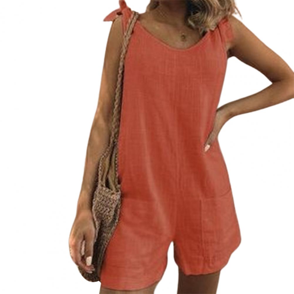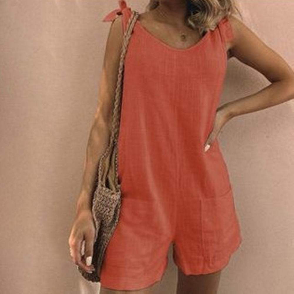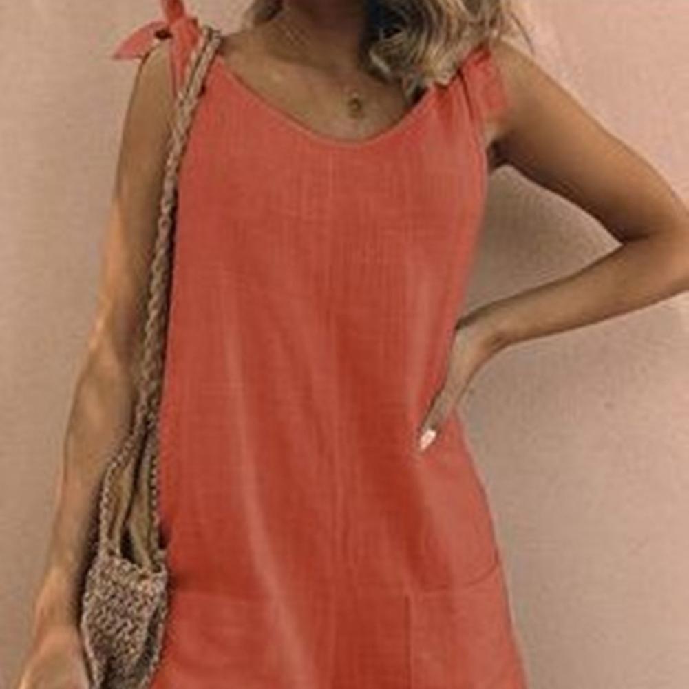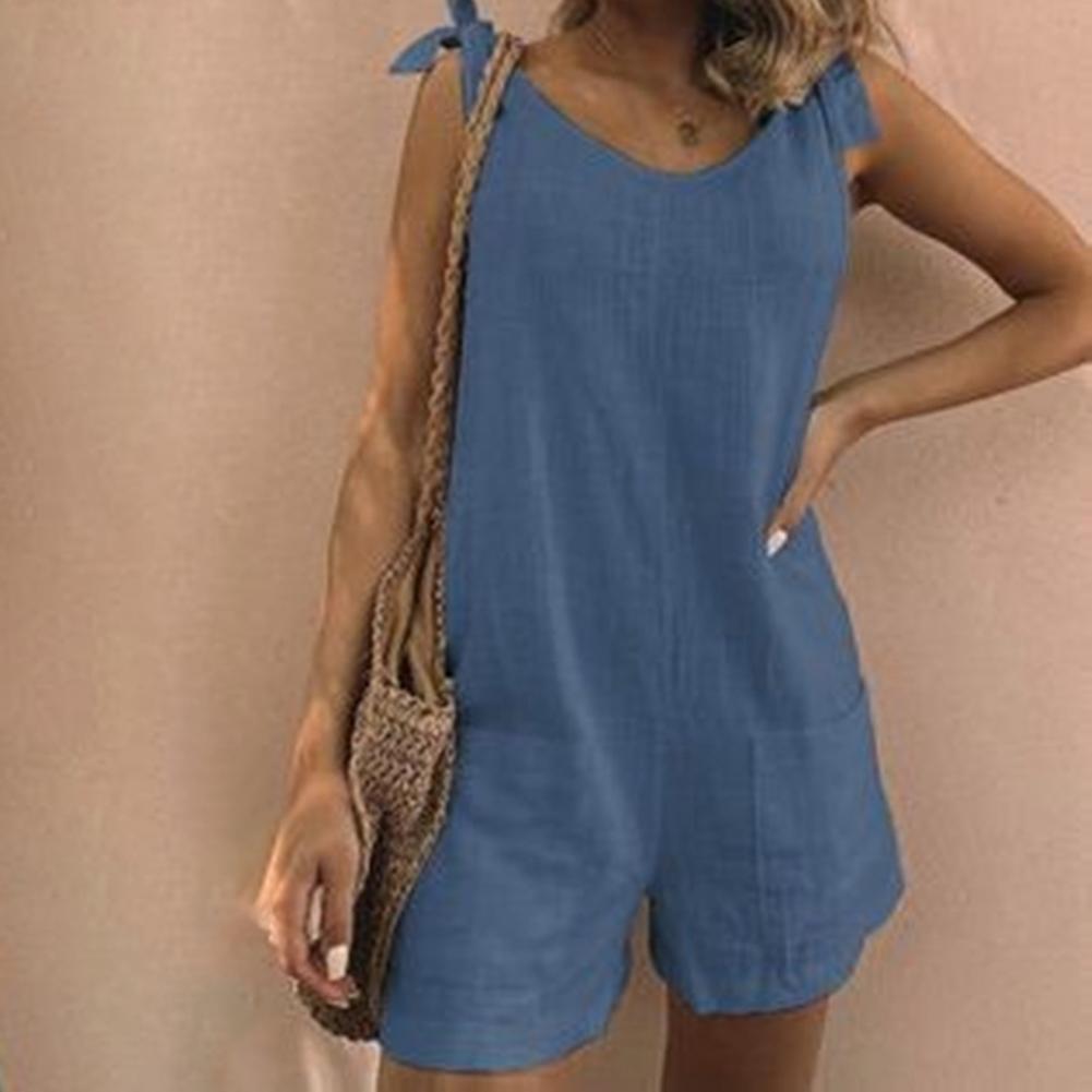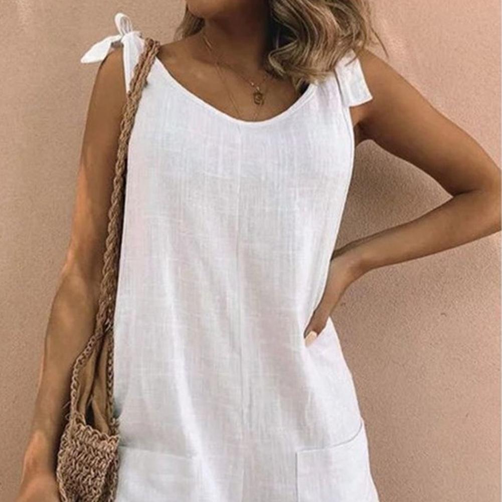 Регулируемый плечевой ремень можно использовать для завязывания красивого банта. Однотонный комбинезон с круглым вырезом, повседневный и простой.