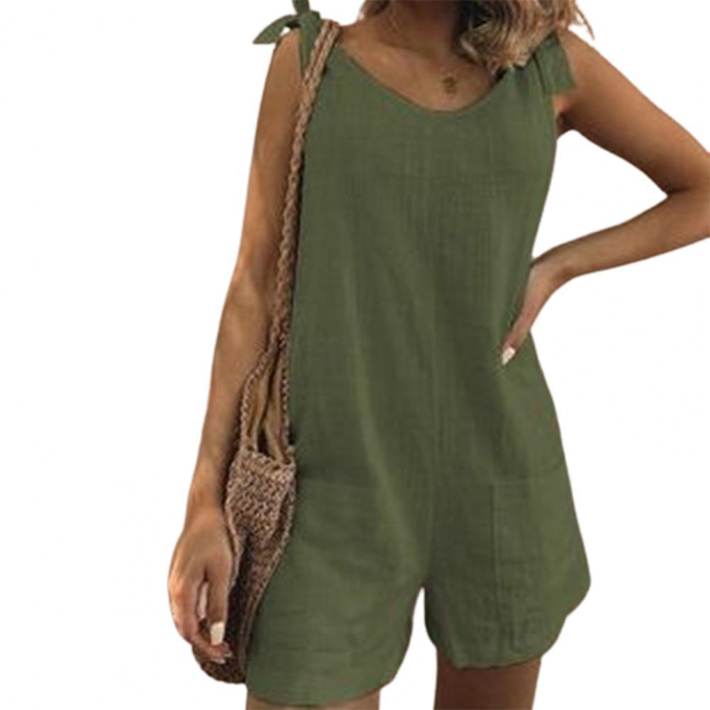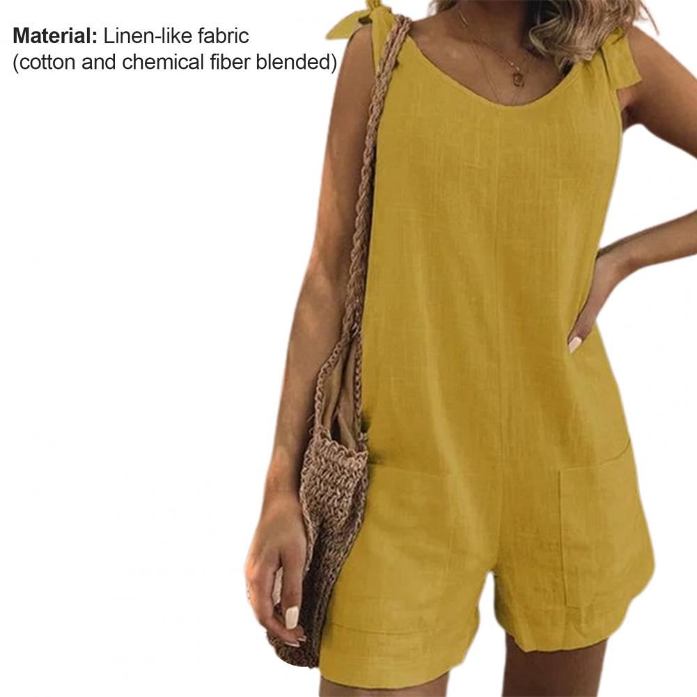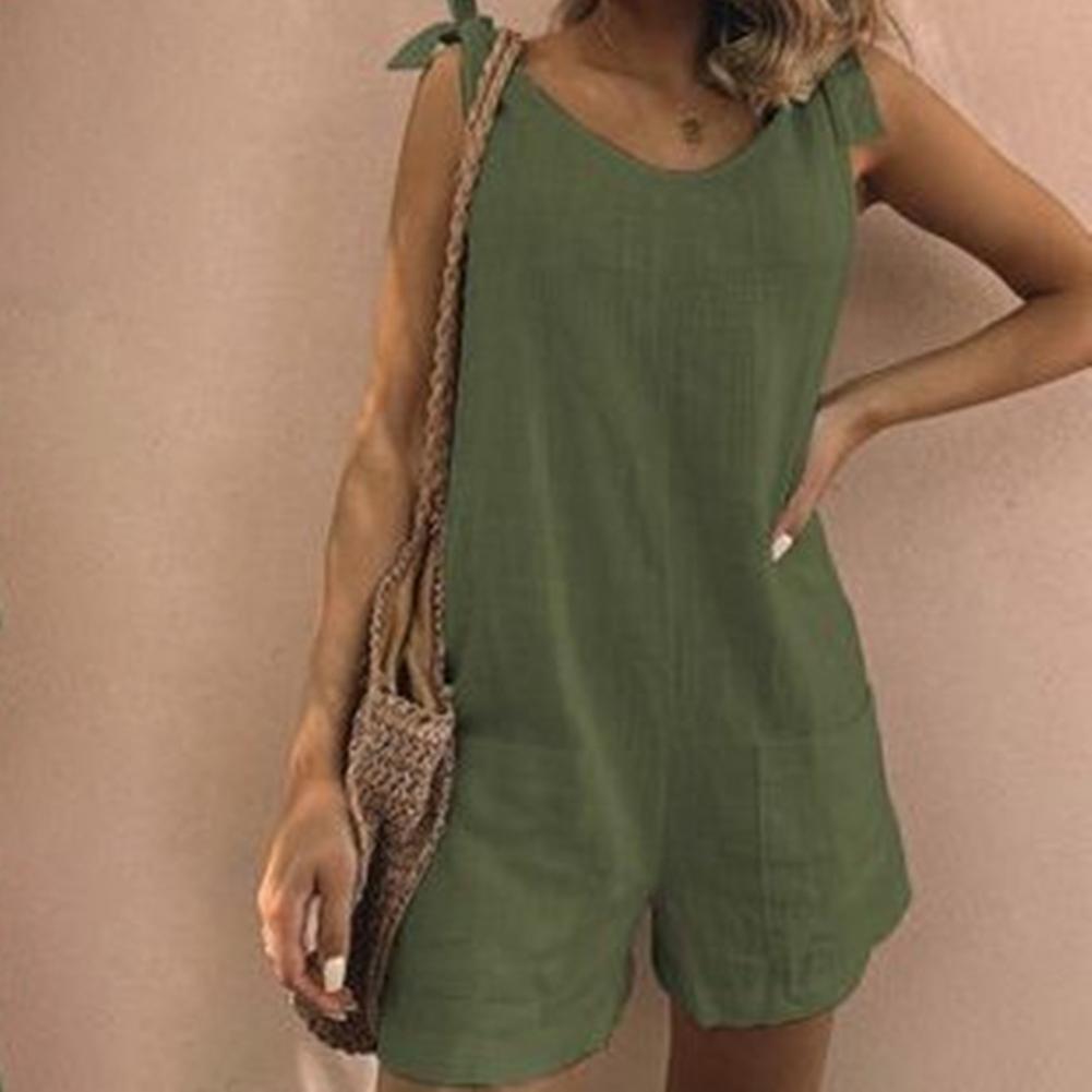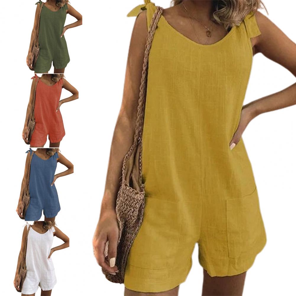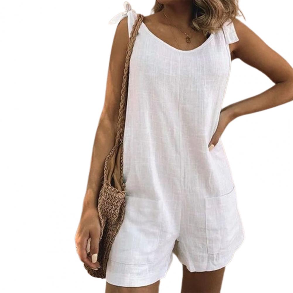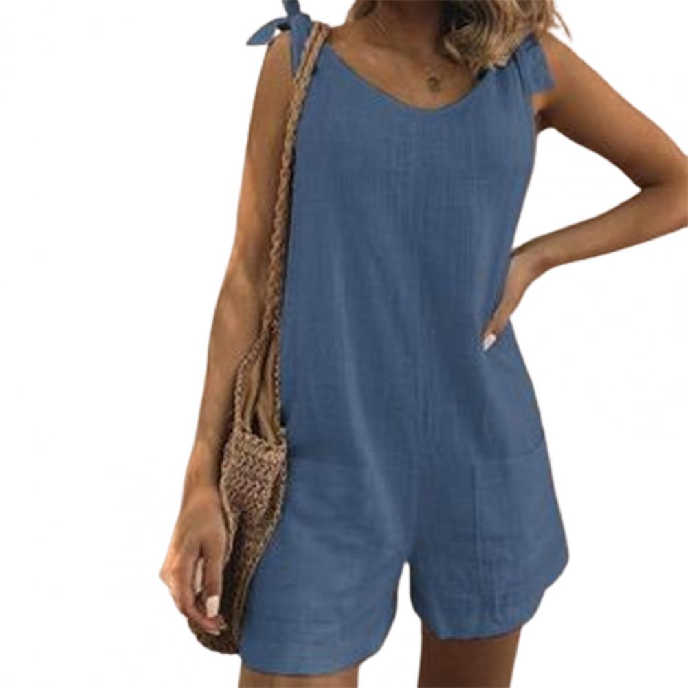 Регулируемый плечевой ремень можно использовать для завязывания красивого банта. Однотонный комбинезон с круглым вырезом, повседневный и простой.