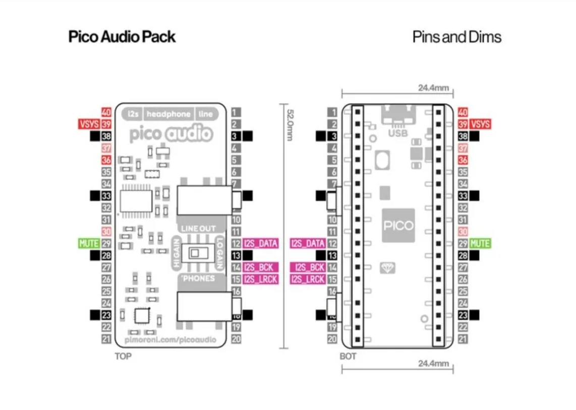 Аудиопакет Pico предоставляет высококачественный стерео ЦАП, в котором используются I2S_DATA, I2S_BCK и I2S_LRCK для получения аудиоданных.
