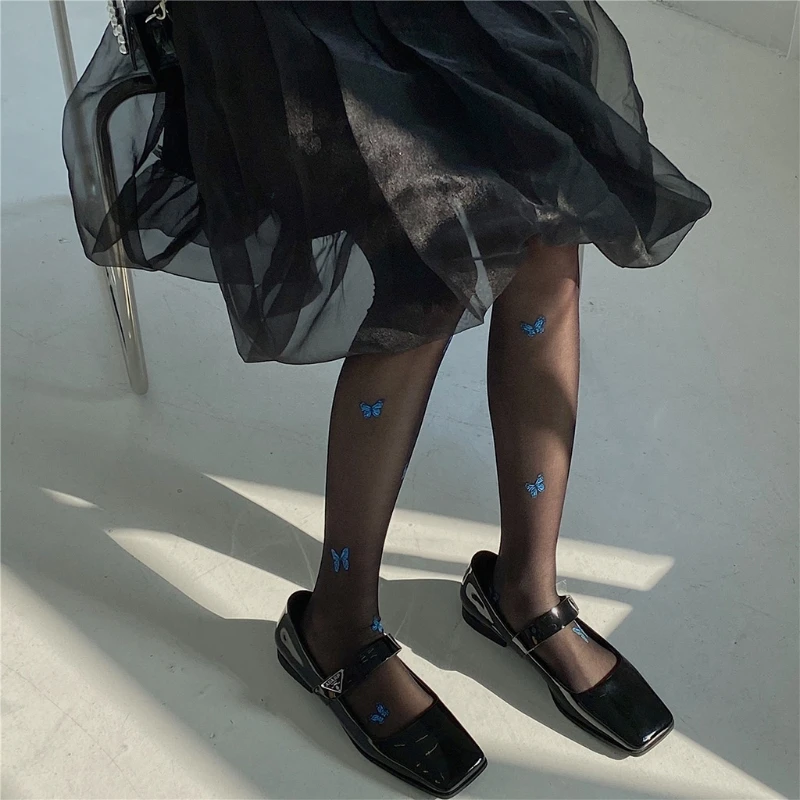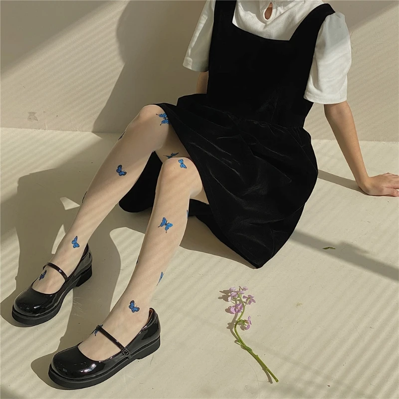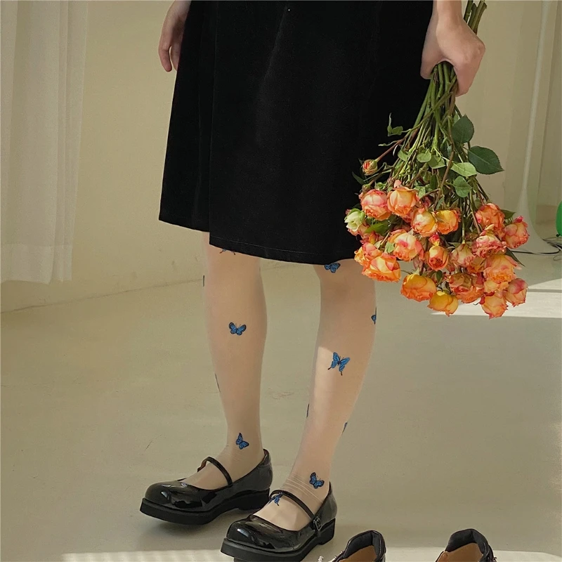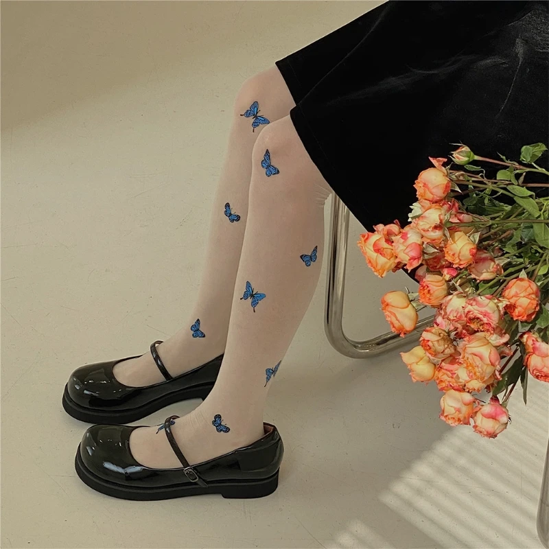 Японский стиль; Милые синие колготки с принтом бабочки; Прозрачные колготки. Поддерживающий Пояс защищает чулки от падения