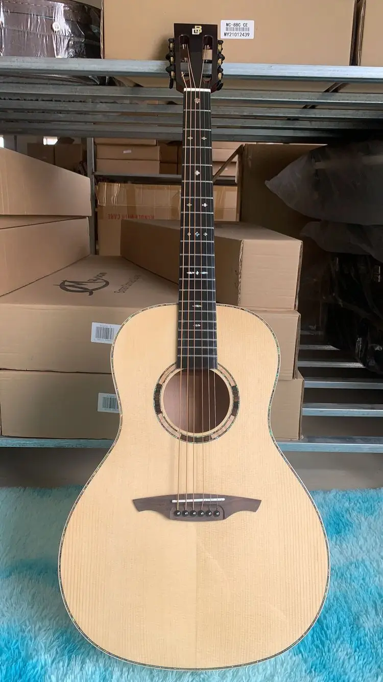 Акустическая гитара из цельного дерева, 38 дюймов, Еловая древесина, верх, пламя, клен, задняя и боковая сторона, 6 струн, 20F, высокий глянец с классической головкой