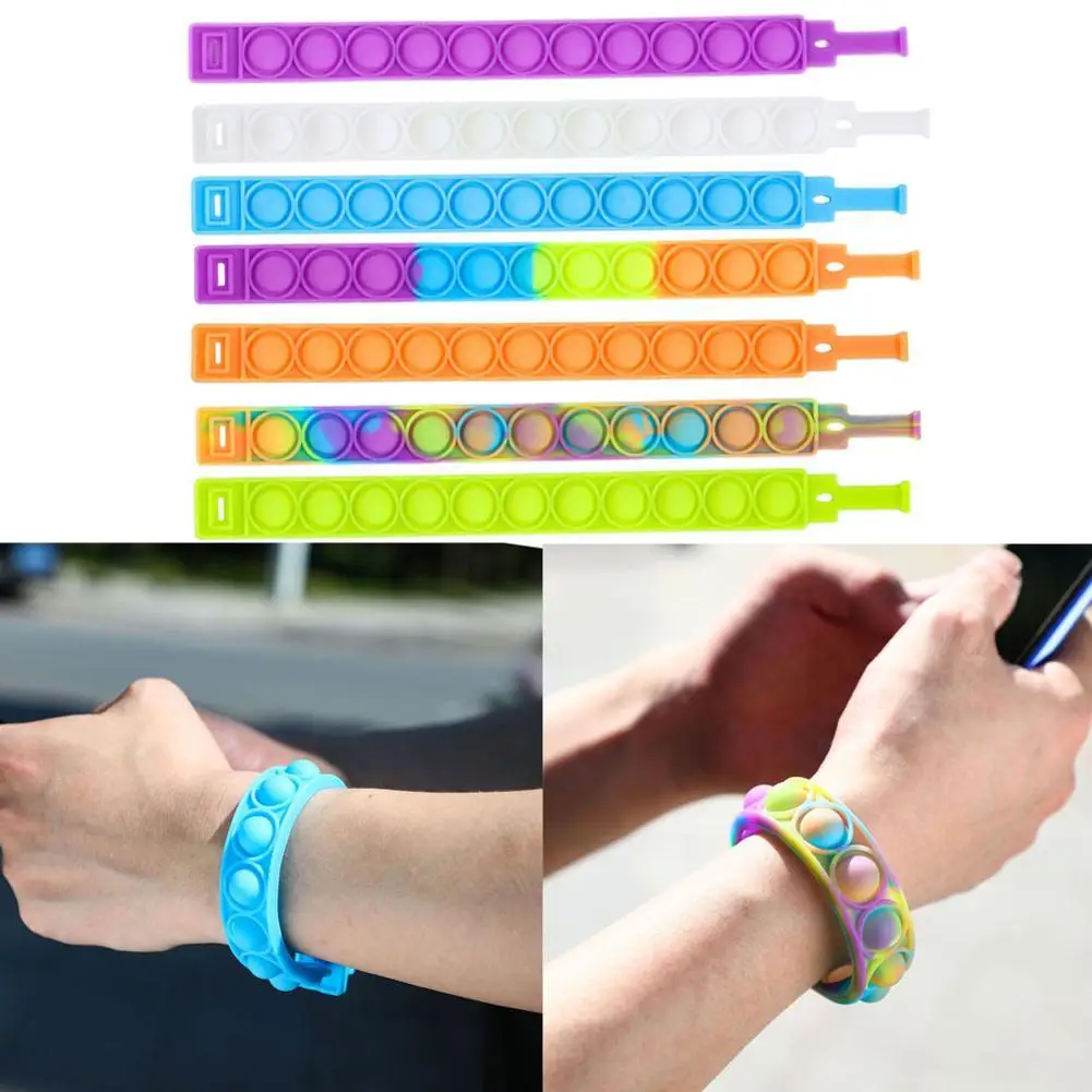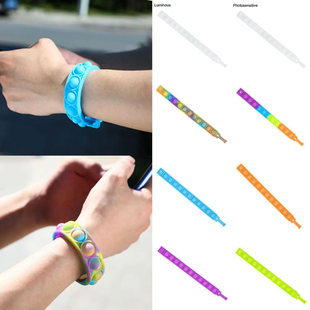 Параметры Цвет: фиолетовый, зеленый, синий, оранжевый, галстук-краска/камуфляж, Радужный цвет, светящийся белый, ультрафиолетовый светильник, чувствительный белый Материал: силикон Вес: около 18 г Особенности: снятие стресса Снимайте беспокойство, снимайте скуку Размеры: 23,5*2 см Особенности Гибкий браслет Не деформируется Высококачественный силиконовый браслет, отличная прочность Прочный и не деформируемый Посылка 1 * распакованный браслет