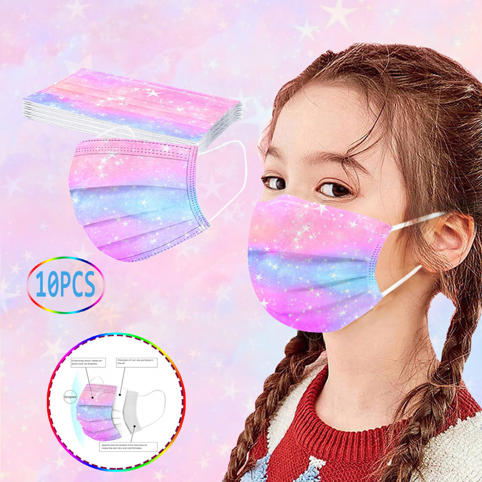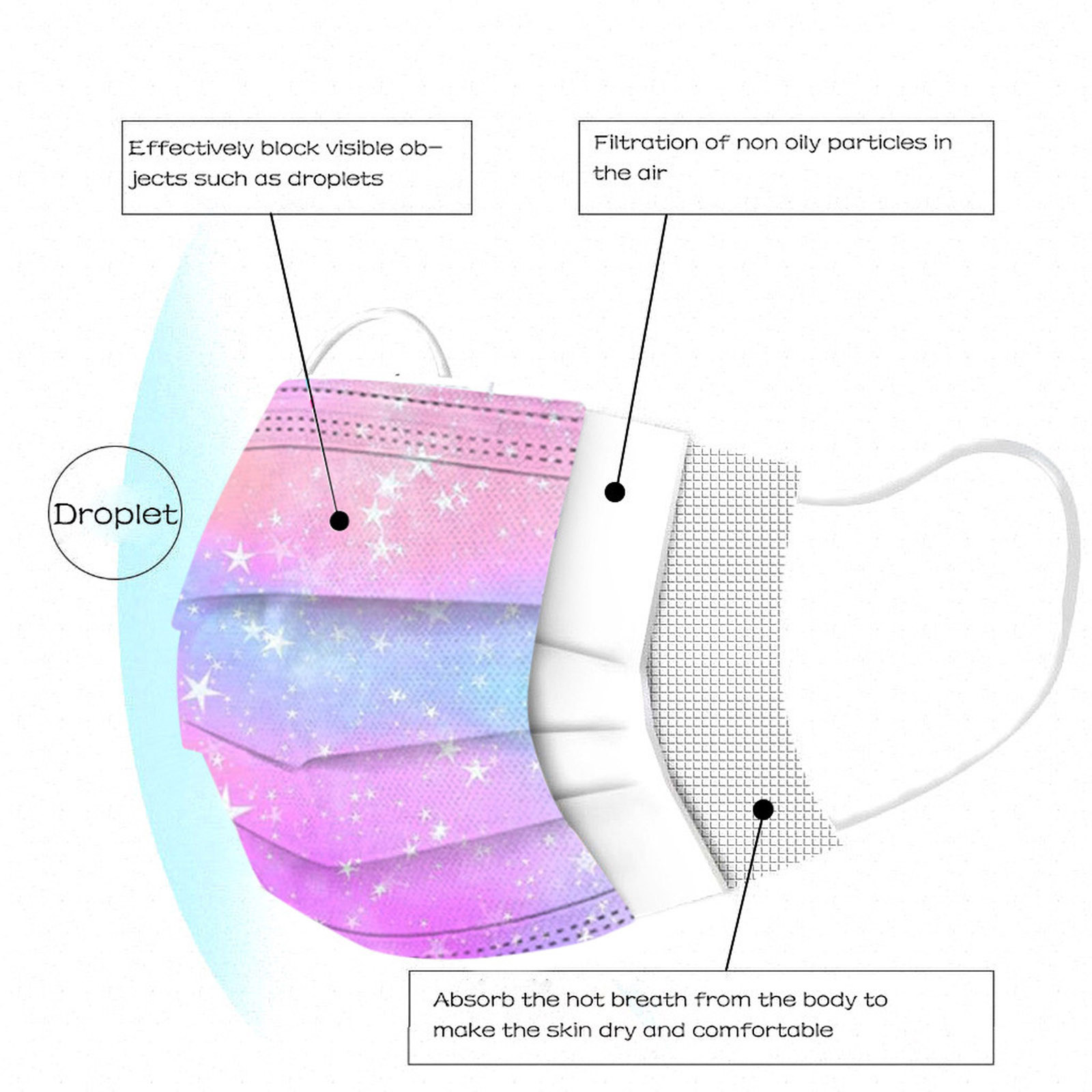 В 3 слоя Нетканая одноразовая маска изготовлена из 3 слоев нетканого материала, Безопасен и безопасен для использования. Дышащий материал и милый Узоры, которые делают его полезным и модным. Специальный 3 слоя из нетканого материала Дизайн, обеспечивает некоторую защиту от пыли, автомобильных выхлопных газов, Пыльца и т. д. эластичная Ушная петля, легко носить и не давит на уши. Маникюрный салон или любые другие области, где может потребоваться защита