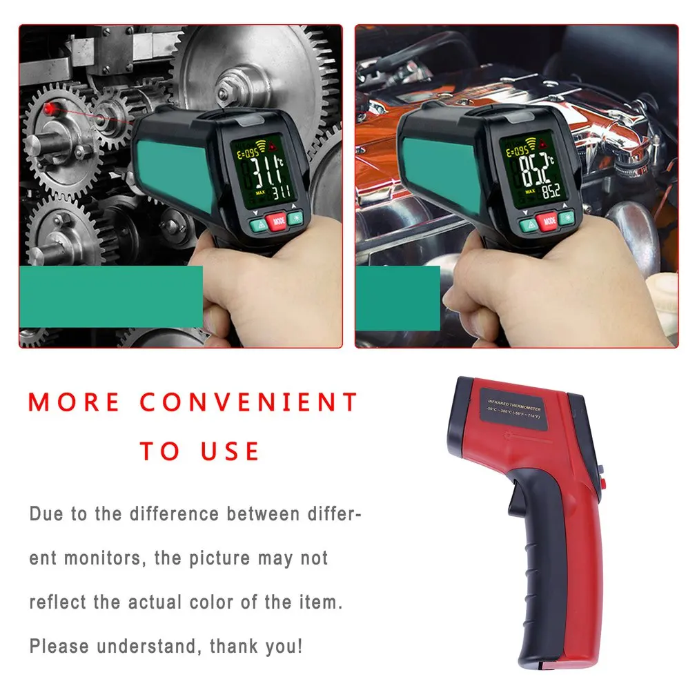 4. Бесконтактный: продукт принимает инфракрасный датчик для измерения, Просто наведите термометр на поверхность, чтобы измерить и потяните триггер, чтобы получить показания температуры немедленно, так удобно и безопасно.