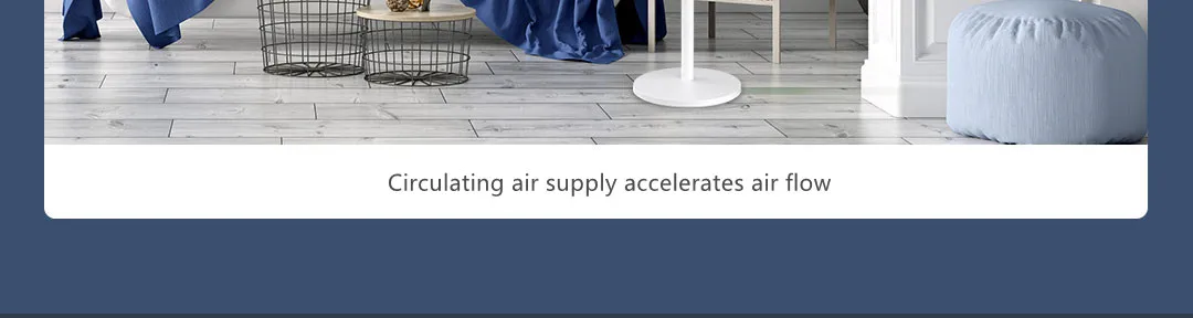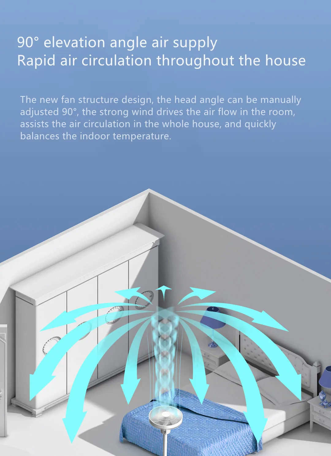 Быстрая циркуляция воздуха по всему дому Новый дизайн конструкции вентилятора, угол головы может быть вручную отрегулирован на 90 °, сильный ветер движет поток воздуха в комнате, помогает циркуляции воздуха во всем доме, И быстро балансирует температуру в помещении.
