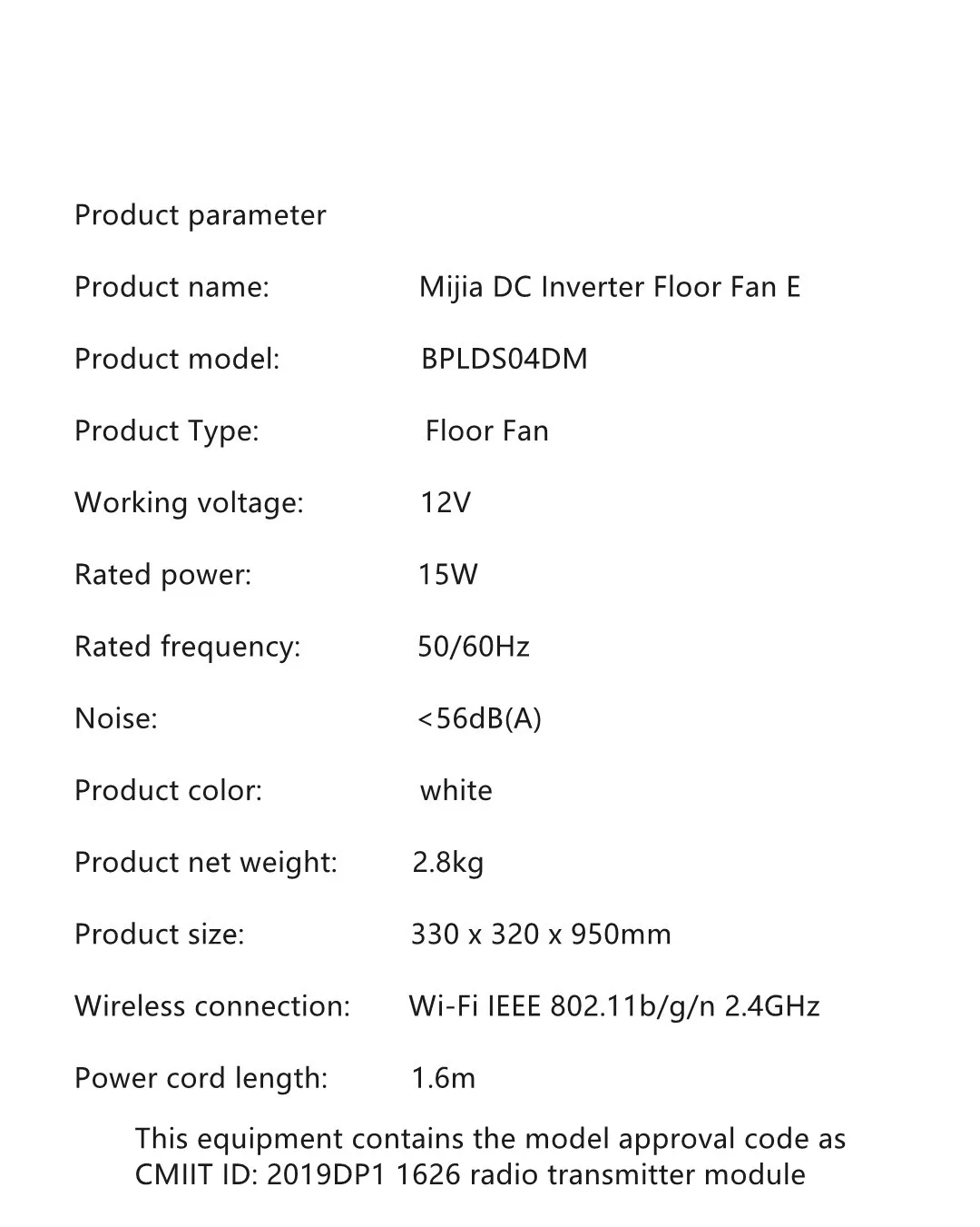 Параметры продукта Название продукта: Mijia DC инвертор напольный вентилятор E Модель продукта: BPLDS04DM Тип товара: напольный вентилятор Рабочее напряжение: 12 В Номинальная мощность: 15 Вт Номинальная частота: 50/60 Гц Шум: <56дб (A) Цвет изделия: белый Вес нетто: 2,8 кг Размер изделия: 330x320x950 мм Беспроводной подключение: Wi-Fi IEEE 802.11b/g/n 2,4 ГГц Мощность Длина шнура: 1,6 м Это оборудование содержит код утверждения модели как CMIIT ID: 2019DP1 1626 радио передатчик Модуль
