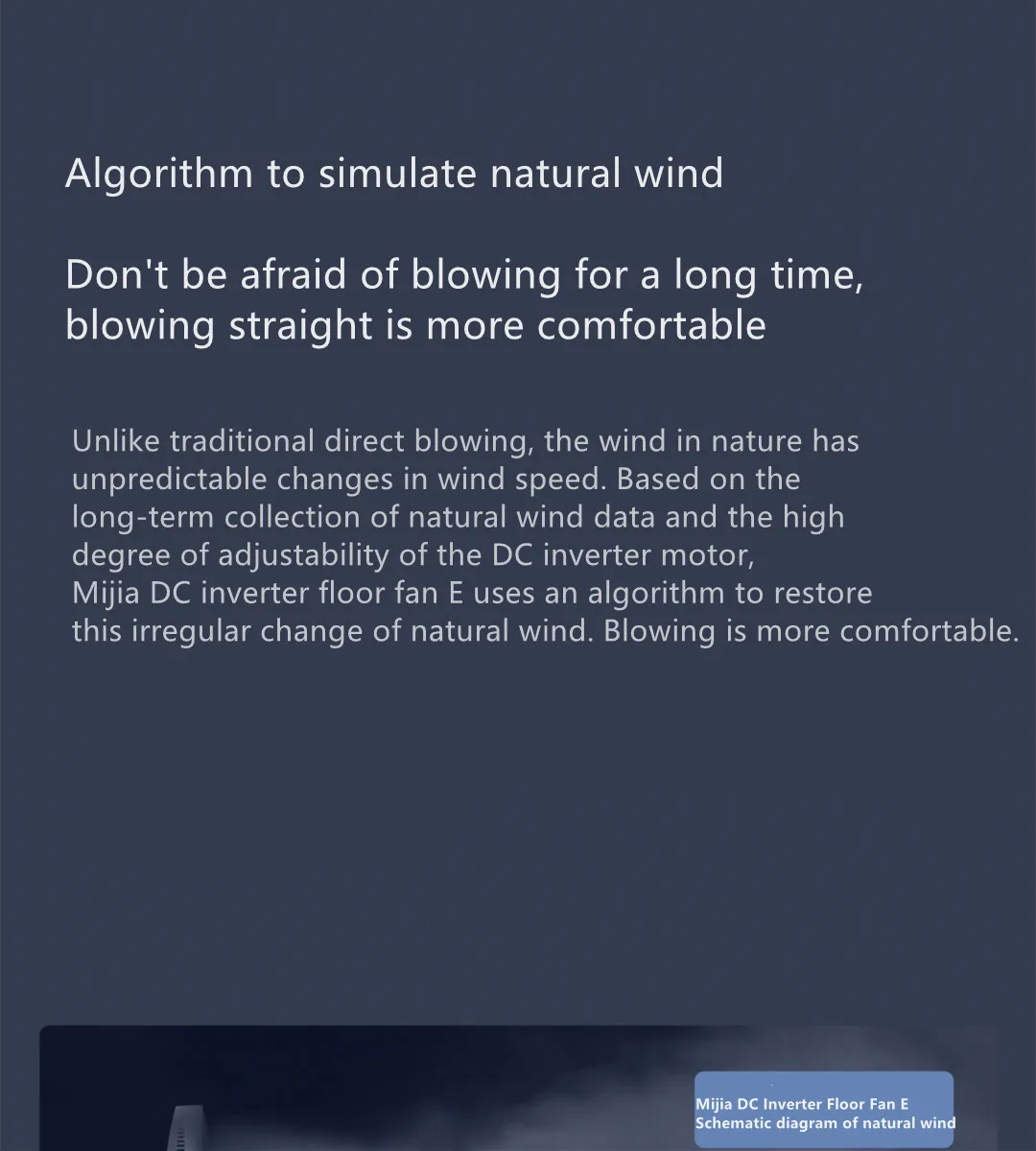 Не бойтесь продувать в течение длительного времени, выдувание прямой более удобно В отличие от традиционного прямого выдувания, ветер в природе имеет незначительные изменения в скорости ветра. На основе долгосрочного сбора данных о естественном ветре и высокой степени регулировки инверторного двигателя постоянного тока, mijia DC инвертор напольный вентилятор E использует алгоритм для восстановления этого неправильного изменения естественного ветра. Выдувание более комфортное.