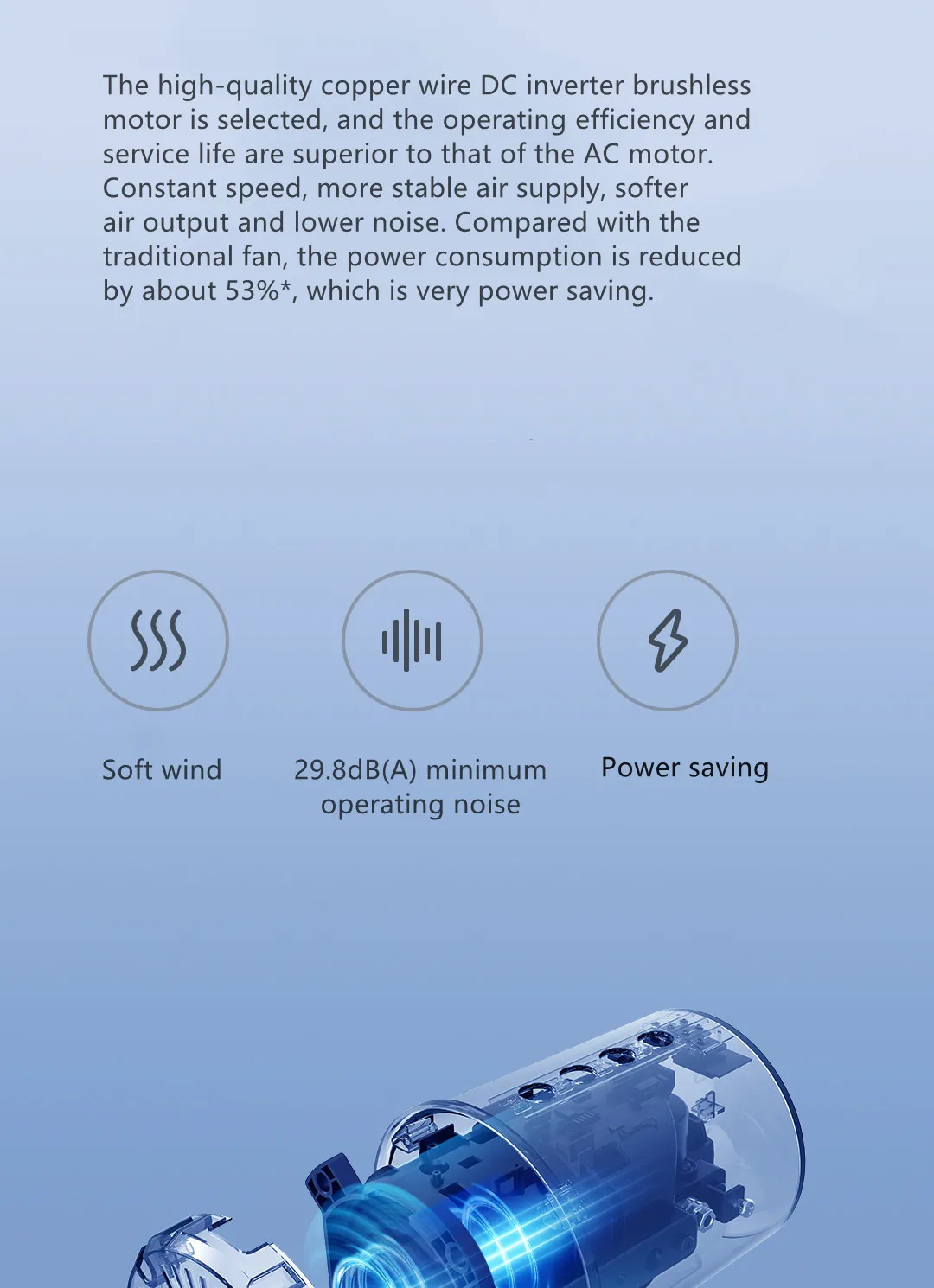 Выбран высококачественный бесщеточный мотор инвертора постоянного тока с медным проводом, а эффективность работы и срок службы превосходят работу двигателя переменного тока. Постоянная скорость, более стабильная подача воздуха, более мягкий выход воздуха и более низкий уровень шума. По сравнению с традиционным вентилятором, потребление энергии уменьшается примерно на 53% *, что очень экономит энергию.