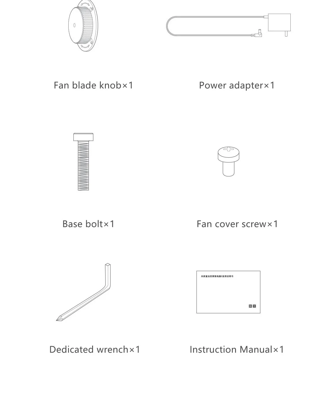 Двигатель × 1 Верхняя Пиллар × 1 Нижняя pillar×-1 шт. Base× 1 Сборка вентилятора × 1 Задний колпачок × Ноб× 1 лопасти вентилятора Адаптер питания × 1 Базовый болт × 1 Крышка вентилятора отвертка × 1 Выделенный wrench× 1 Руководство пользователя × 1