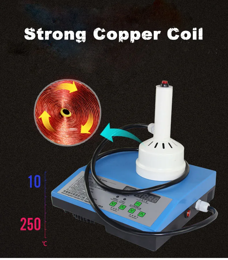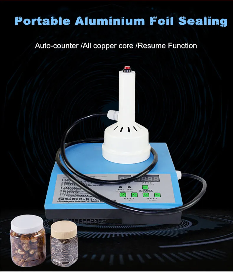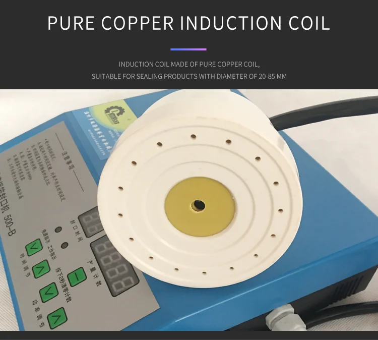 Портативная Электромагнитная Индукционная машина для запечатывания алюминиевой фольгой принимает принцип индукционного нагрева электромагнитного поля, который использует высокочастотный ток для создания магнитного поля через индуктивную катушку. Когда магнитное поле проходит через уплотнительный материал алюминиевой фольги, мгновенно генерируется большое количество небольших вихревых токов, что заставляет алюминиевую фольгу нагреваться на высокой скорости, И расплавляет соль, смешанный на алюминиевой фольге, Таким образом, придерживаясь уплотнения объекта запечатывания для достижения цели быстрого запечатывания.