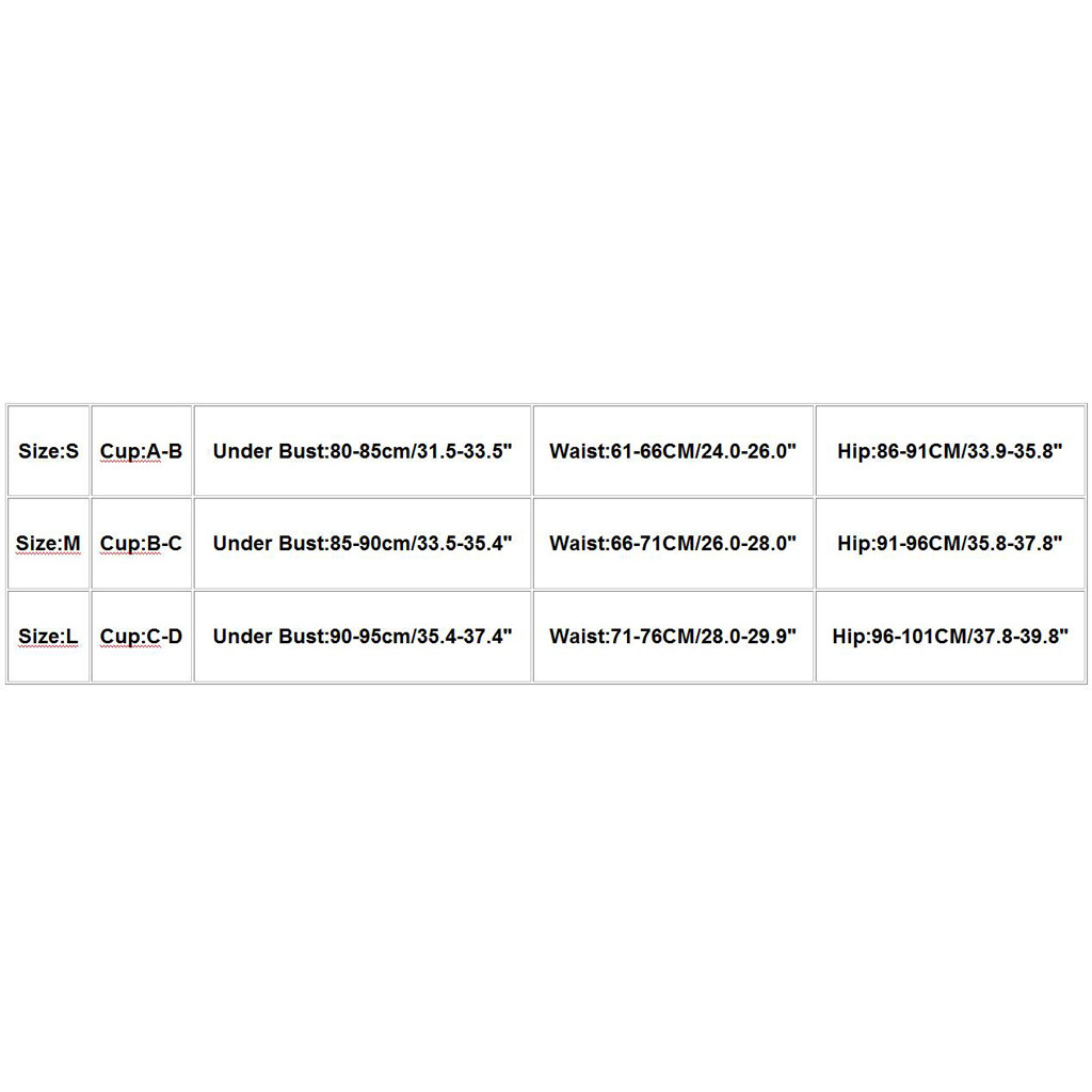 Размеры Чашка Под грудью Талия Бедра S A-B 80-85 см/31,5-33,5" 61-66 см/24,0-26,0" 86-91 см/33,9-35,8" М B-C 85-90 см/33,5-35,4" 66-71 см/26,0-28,0" 91-96 см/35,8-37,8" L C-D 90-95 см/35,4-37,4" 71-76 см/28,0-29,9" 96-101 см/37,8-39,8"