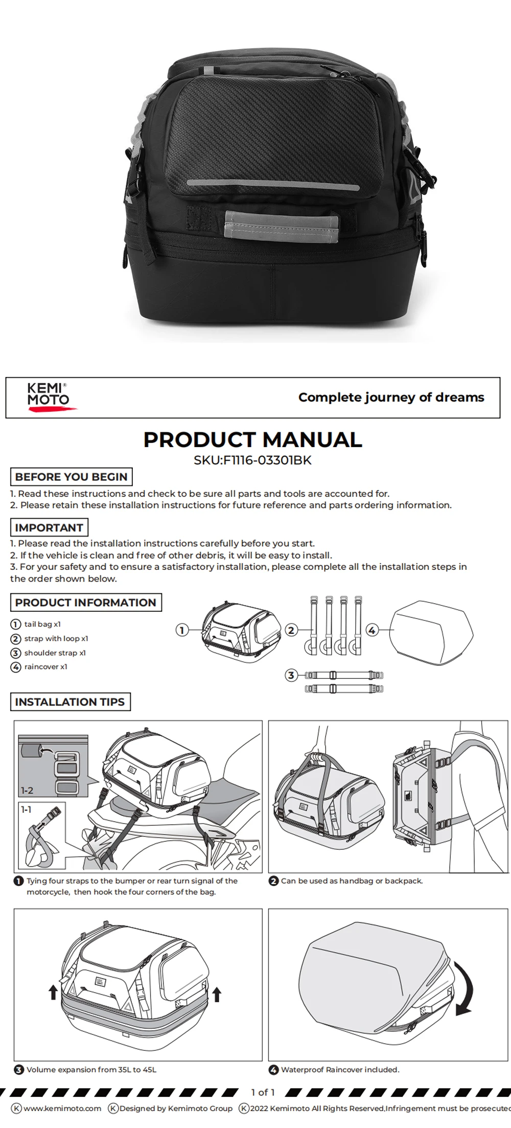Вместимость: с объемом 35-42 л, компактный и складной и идеально подходит для коротких поездок (можно положить полный шлем)