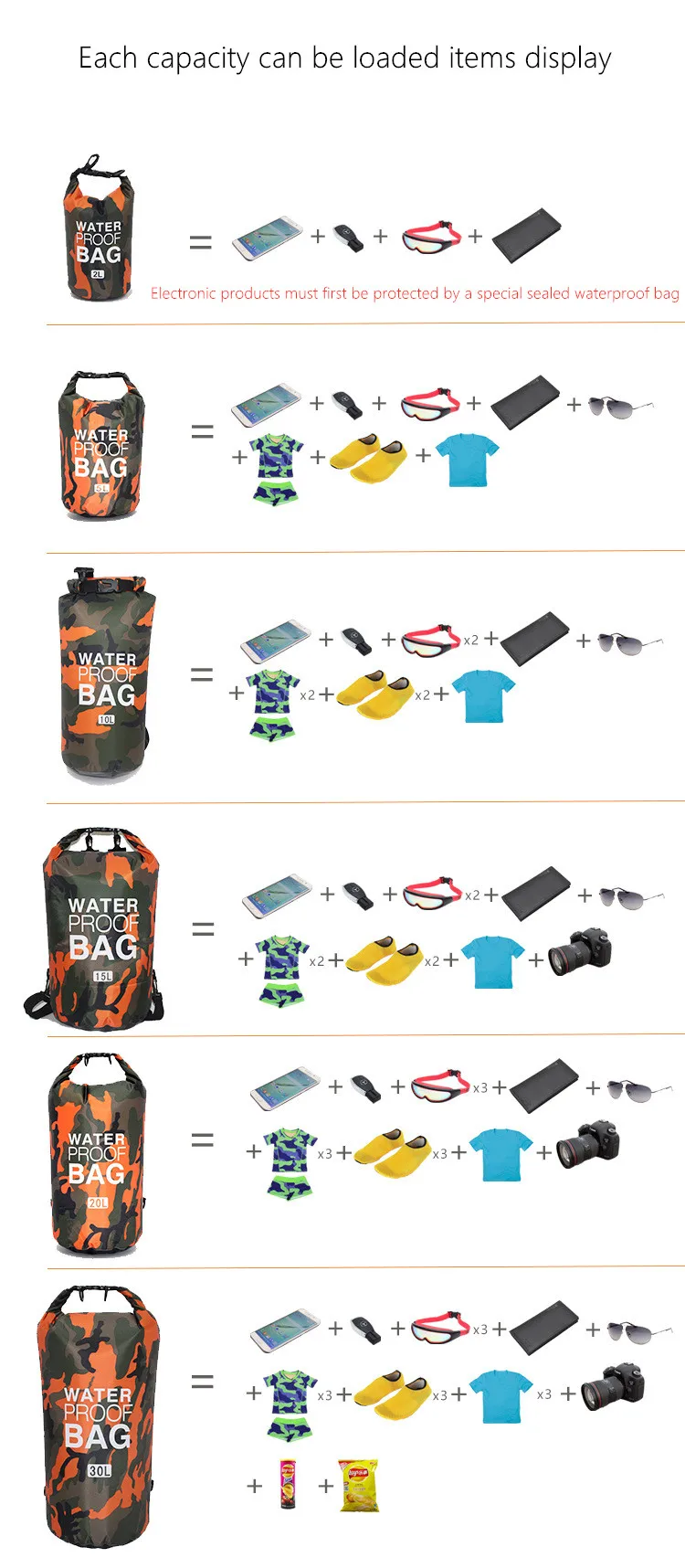 ♦Водонепроницаемая сухая сумка, необходимая для кемпинга, рыбалки, фестивалей, пляжей, пеших прогулок, гребли на каноэ, альпинизма и т. Д. Сохраняет ваши предметы в идеальном и сухом состоянии.