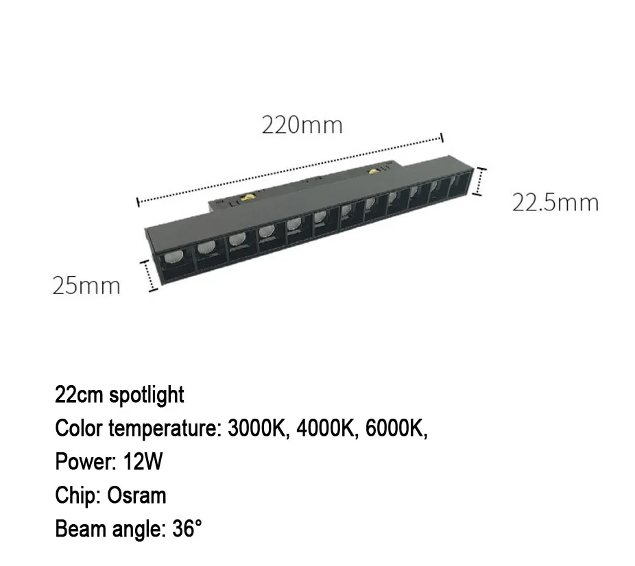 Размер прожектора:Размеры: длина 220 мм, ширина 22,5 мм, высота: 25 ммМощность: 12 ВтЧип: OsramЦветовая температура: 3000K, 4000K, 6000KУгол луча: 36 °Напряжение: 48 в