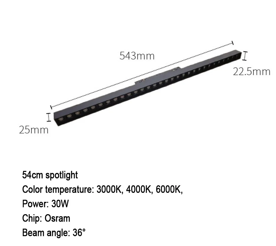 Размер прожектора:Размеры: Длина 543 мм, ширина 22,5 мм, высота: 25 ммМощность: 30 ВтЧип: OsramЦветовая температура: 3000K, 4000K, 6000KУгол луча: 36 °Напряжение: 48 в