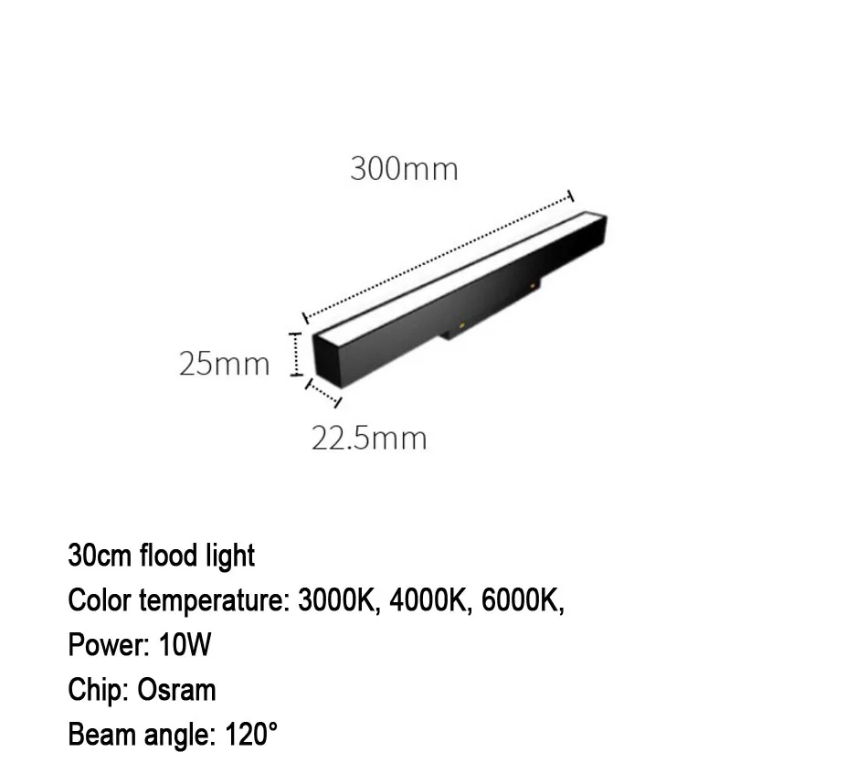 Размер прожектора:Размеры: длина 300 мм, ширина 22,5 мм, высота: 25 ммМощность: 10 ВтЧип: OsramЦветовая температура: 3000K, 4000K, 6000KУгол луча: 120 °Напряжение: 48 в