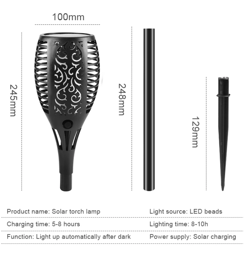 -Питание от солнечной энергии: это наружное пламя солнечных факелов собирает солнечную энергию в течение всего дня под прямыми солнечными лучами, затем включается автоматически в сумерках. Светильник работает на солнечной энергии, поэтому вы можете разместить его в любом месте под прямым солнечным светильник!