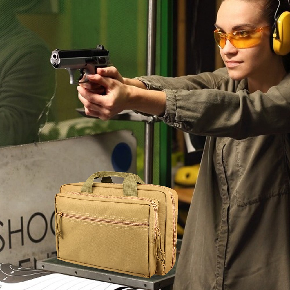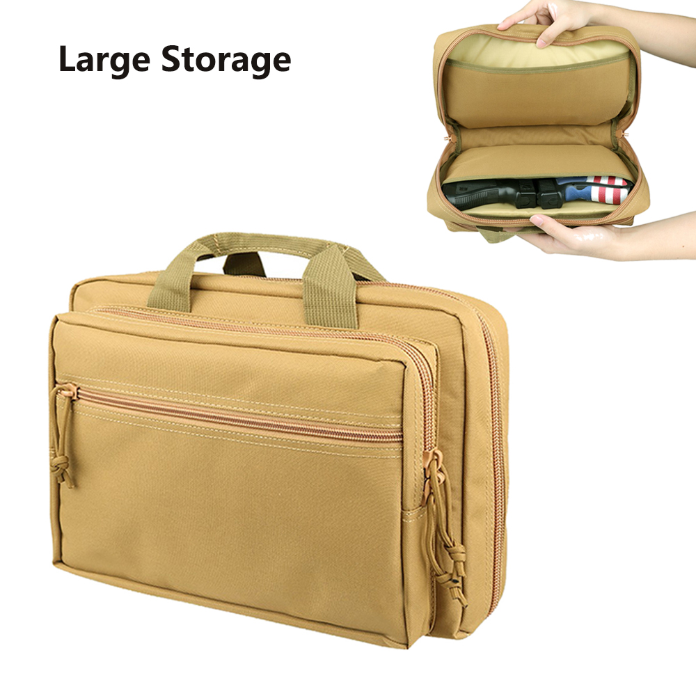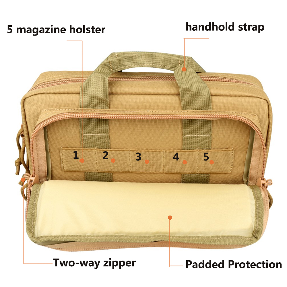 1. Изготовлены из высококачественного нейлона, удобные, прочные и износостойкие. 2. Мульти-карманы оружейного мешка, он может быть держать пистолет, журнал или другие инструменты. 3. С мягким отсеком, он может предотвратить повреждение вашего оружия. 4. Двусторонняя гладкая молния, очень удобно получить инструменты.