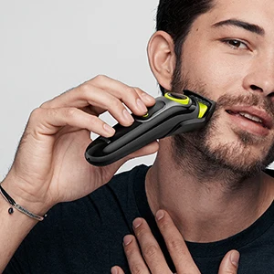 Создайте Точные линии и края на шее и щеках с помощью головки триммера для бороды Braun.