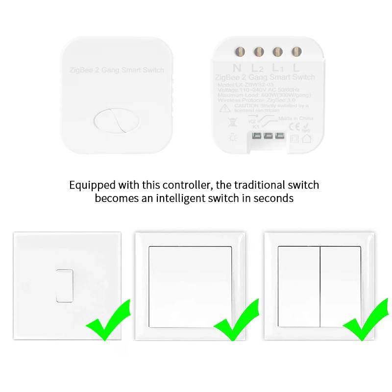 2. Протокол ZigBee 3,0 с мини-дизайном для настенная коробка переключателей, И легко спрятать его в вашу скрытую настенная коробка переключателей вашего традиционного переключателя без какого-либо влияния на ваш оригинальный стиль украшения, чтобы сделать его умным, предоставляя вашим устройствам максимальную мощность включения/выключения, умный макияж и конвертировать большинство любых совместимых продуктов в умные; Традиционный переключатель и этот умный модуль могут работать независимо без помех. (Пожалуйста, подтвердите, соответствует ли размер продукта вашей собственной коробке переключения перед покупкой)