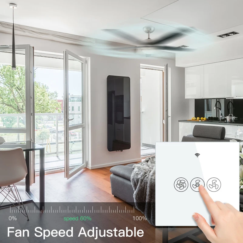 1,2/3-way multi-control association для управления 1 потолочным вентилятором с несколькими переключателями; Панель из закаленного стекла с защитой от царапин подходит для любого домашнего декора и обеспечивает легкое сенсорное управление; этот переключатель можно связать с несколькими различными переключателями в приложении Smart Life.