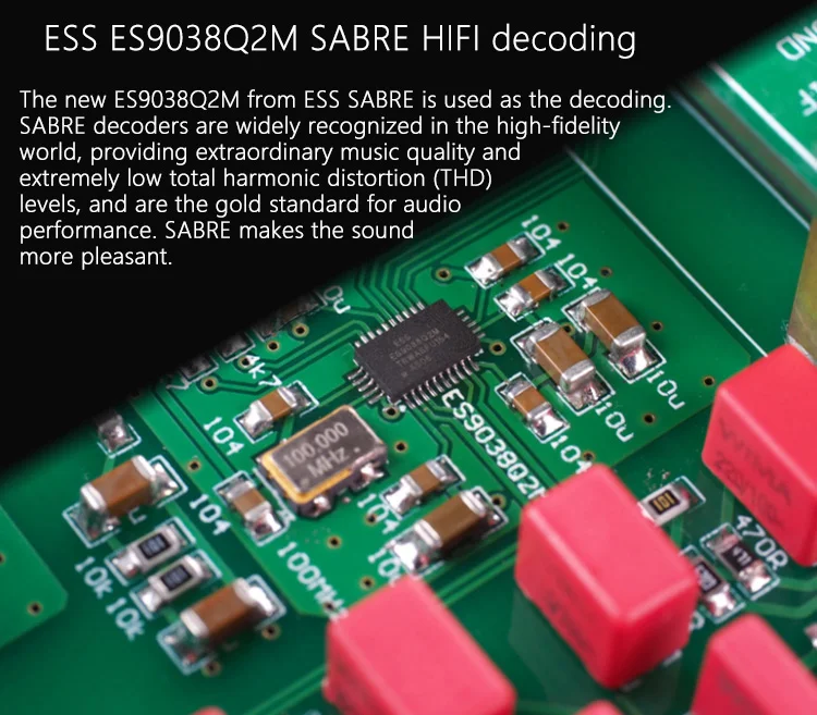NXC01 использует в качестве декодирования Новый ES9038Q2M от ESS SABRE. Декодеры SABRE широко признаны в мире высокой точности и могут обеспечить исключительное качество музыки и чрезвычайно низкие уровни гармонических искажений (THD). Поддержка PCM44.1-384 кГц/16-32 бит. Поддержка DSD64-256DOP. Он также обеспечивает 7 различных режимов фильтра PCM для удовлетворения различных предпочтений прослушивания. Интерфейс USB оснащен модулем XMOS XU208, с помощью чипа второго поколения XMOS XU208 в качестве интерфейса USB. Низкий уровень дрожания и низкий уровень шума поддерживают замену аудио с высоким разрешением, особенно DSD Native. Он также оснащен цифровым чипом формирования XILINX, который использует переключение XILINX и технологию цифрового формирования для улучшения деталей дрожания сигнала часов и предотвращения переключения pops.