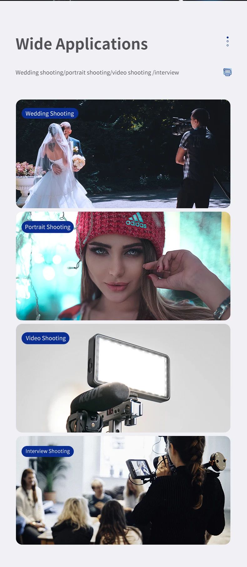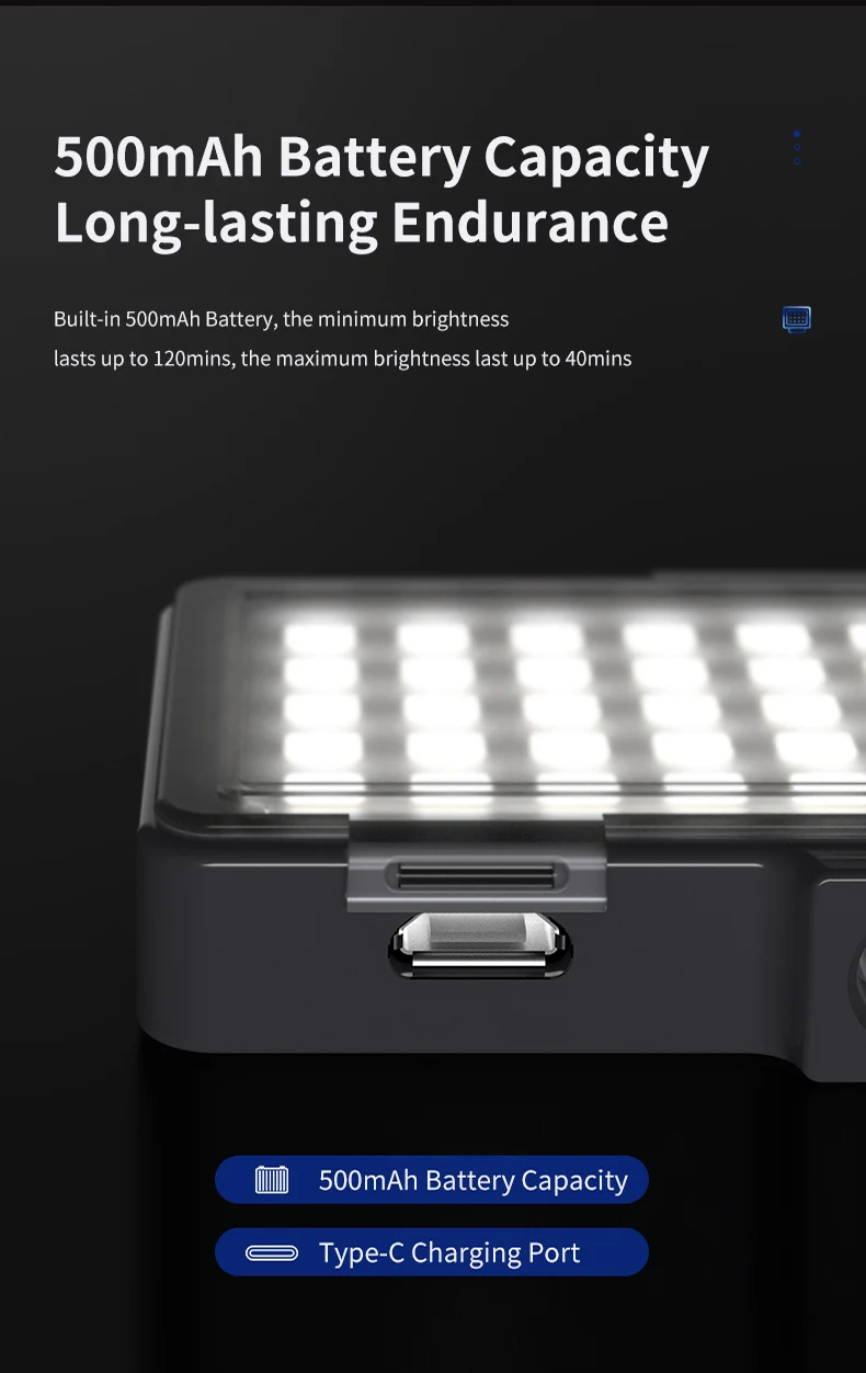 2,3 уровней яркости, встроенная литиевая батарея, 50 светодиодный бусины, USB type-c для зарядки, 3 цветных фильтров, легкий и портативный