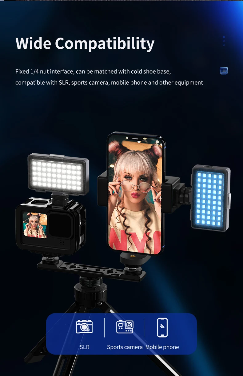 7. Фиксированный интерфейс 1/4 гайки, может быть совместим с базой холодной обуви, совместим с SLR, экшн-камерой, мобильный телефон и другим оборудованием.