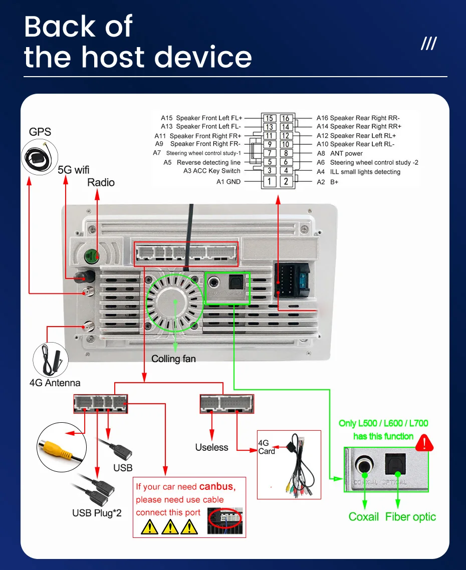 -Обновите систему Android, 8 ядер, 8 Гб ОЗУ 128 Гб ПЗУ, встроенная сеть 4G, поддержка Wi-Fi 5 ГГц. В задней части устройства есть вентилятор охлаждения, встроенный в Carplay Android Auto.