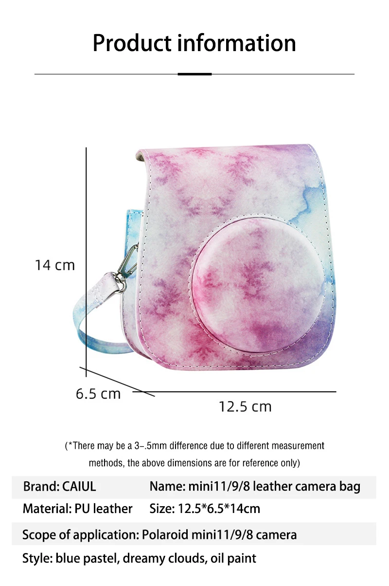 Описание: Название: Кожаная мини-сумка Polaroid в стиле ретро Материал: из искусственной кожи Размеры: 12,5*6,5*14 см Применение: Универсальный для камер Polaroid mini11/9/8 Стиль: синяя Пастельная, мечтательные облака, масляная краска Особенности: Этот чехол для камеры совместим с моментальной камерой Fujifilm Instax Mini 11. Для защиты мгновенной камеры от пыли, отпечатков пальцев и царапин. Чехол может быть снят, так что вы можете делать фотографии, не снимая камеру из сумки. Поставляется с регулируемым плечевым ремнем, удобно носить с собой. Посылка содержит: 1x Polaroid мини кожаная Ретро сумка для камеры 1x плечевой ремень Примечание: Камера, показанная на картинке, не входит в комплект. Пожалуйста, допускайте погрешность 1-5 мм для всех размеров, спасибо за понимание