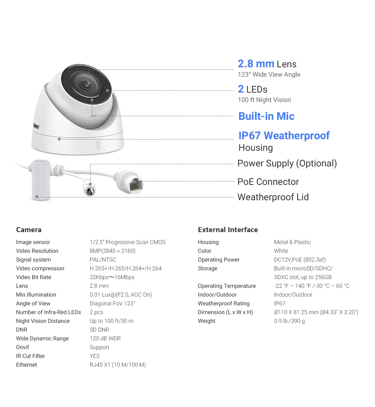 ★Инфракрасная сетевая камера 8 МП★Эффективная технология сжатия H.265 +★2,8 мм объектив с диагональю FOV 123 ° оживляет все★До 100 футов ночного видения с умным ИК★Встроенный микрофон для обеспечения безопасности звука в реальном времени★Поддержка памяти sd-карт до 256 ГБ★Четкое изображение даже при сильном заднем освещении из-за 120 дБ WDR★EXIR 2,0: передовые инфракрасные технологии с дальним ИК-диапазоном до 30 м★Класс защиты от пыли и воды IP67★Поддержка PoE (питание через Ethernet) и DC12V