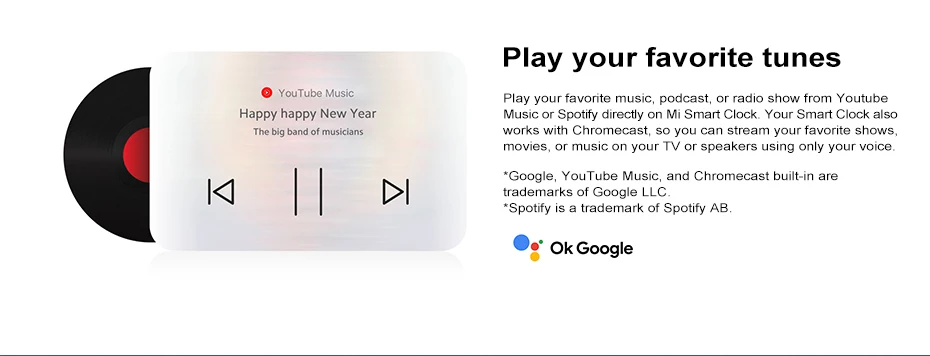 Воспроизведение любимой музыки, подкаста или радиопередачи с Youtube music или Spotify непосредственно на Mi Smart Clock. Ваши умные часы также работают с Chromecast, поэтому вы можете транслировать свои любимые шоу, фильмы или музыку на телевизор или динамики, используя только ваш голос.