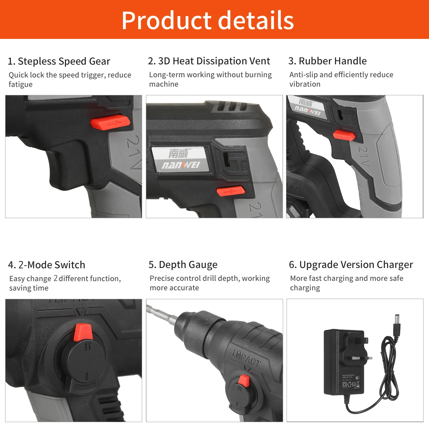 Широкий Применение --- профессиональная роторная дрель молоток, что обеспечивает мощный удар и молот силовое, чтобы завершить светильник службы проектов по дереву, каменной кладки и бетона, что означает, что большинство рабочим потребностям может быть выполнено.