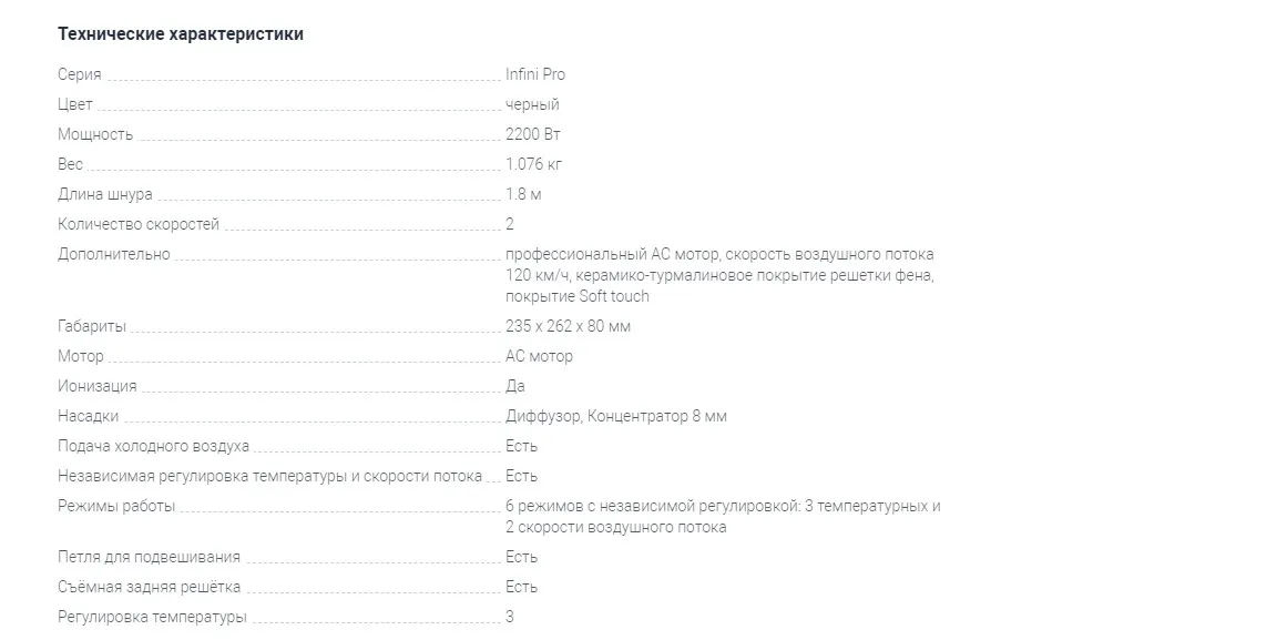 Фен Infini Pro обладает непревзойденной мощностью профессионального АС мотора, который обеспечивает длительную службу и стабильную работу. Максимальная скорость воздушного потока достигает 120 км/ч - быстрая сушка и качественная укладка вам обеспечена, где бы вы ни находились. Благодаря раздельной регулировке температуры и скорости подачи воздуха вам доступно до 6 режимов работы фена, которые можно настроить специально под ваш тип волос. С помощью классического диффузора вы без труда высушите волосы непосредственно у корней и придадите им дополнительный объем, а ультра-тонкий концентратор направит воздушный поток точно на выбранную прядь и создаст стойкую укладку. Функция холодного воздуха прекрасно закрепит результат. После использования фен легко чистится благодаря съемной решетке, и его удобно хранить, подвесив за специальную петлю.