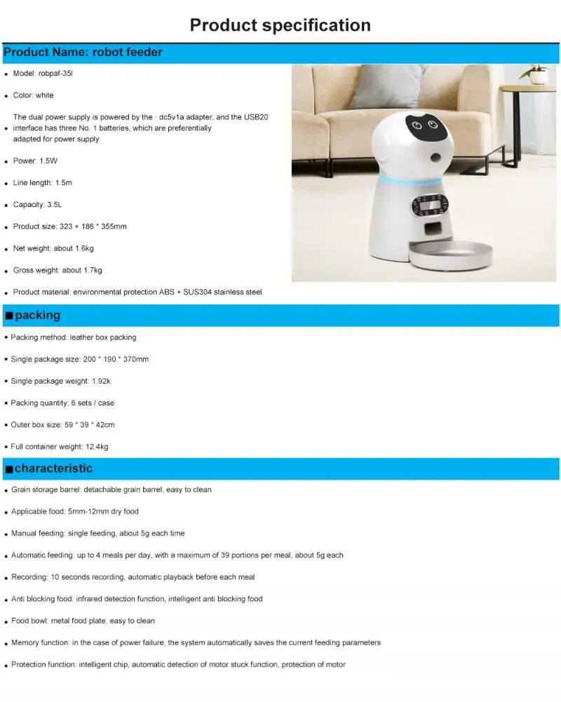 Автоматическая кормушка для домашних животных изготовлена из импортированных экологически безопасных материалов ABS, нетоксичных и пищевых.