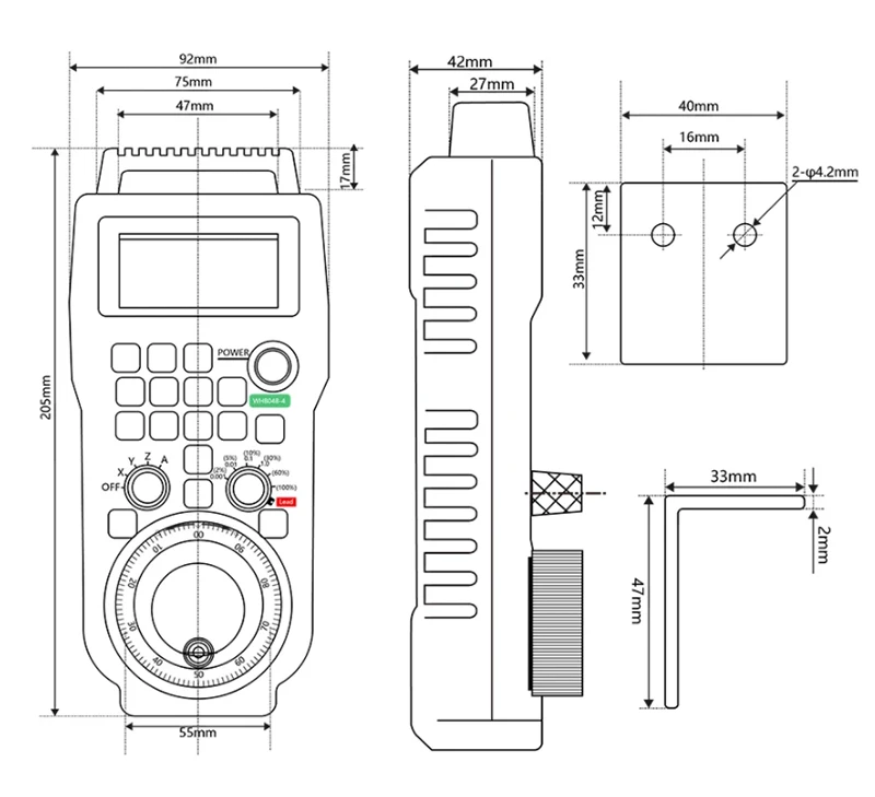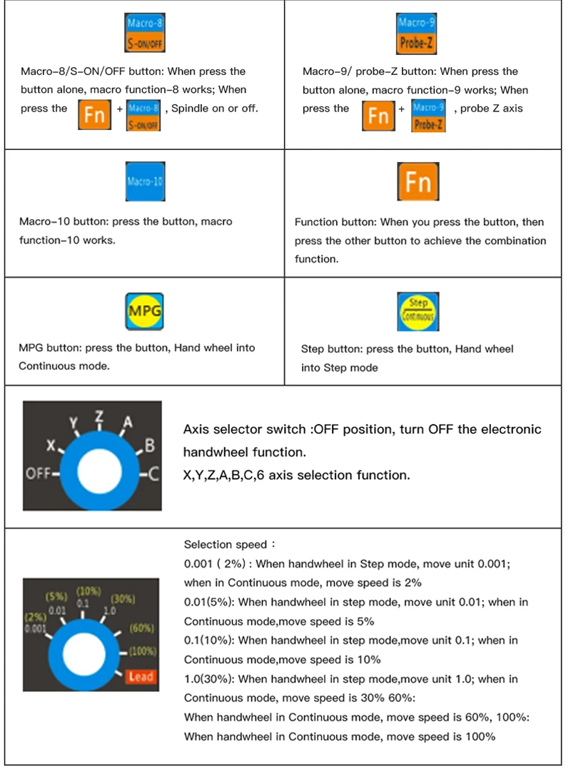 Переключатель выбора оси может реализовать закрытие электронного маховика и контроль выбора соответствующей функции оси XYZ A. Выбор переключателя диапазона реализует выбор значения шага, что является простым и удобным.