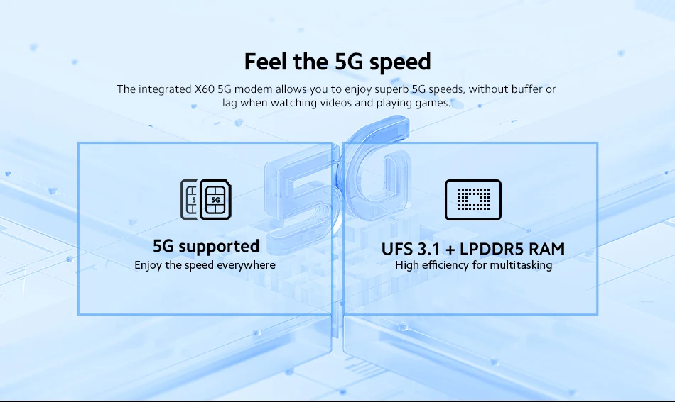 Встроенный модем X60 5G позволяет вам наслаждаться превосходными 5G скоростями, без буферной нагрузки при просмотре видео и воспроизведении игр.